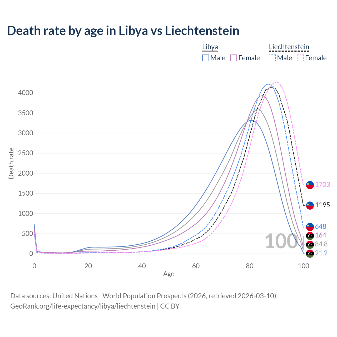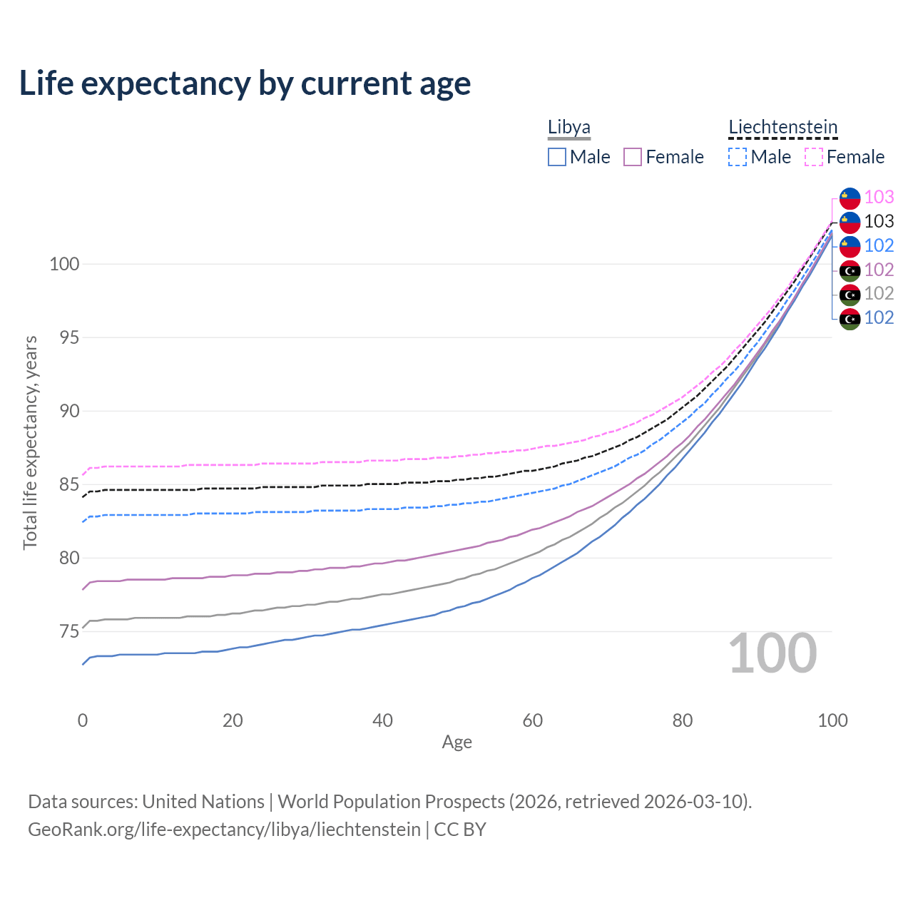 This life expectancy calculator shows the odds of living to 100, 95, 90, and below based on current age for both males and females in Libya and Liechtenstein, along with mean and median age of death. The calculations are based on the 2026 life tables (actuarial tables) from the UN World Population Prospects.