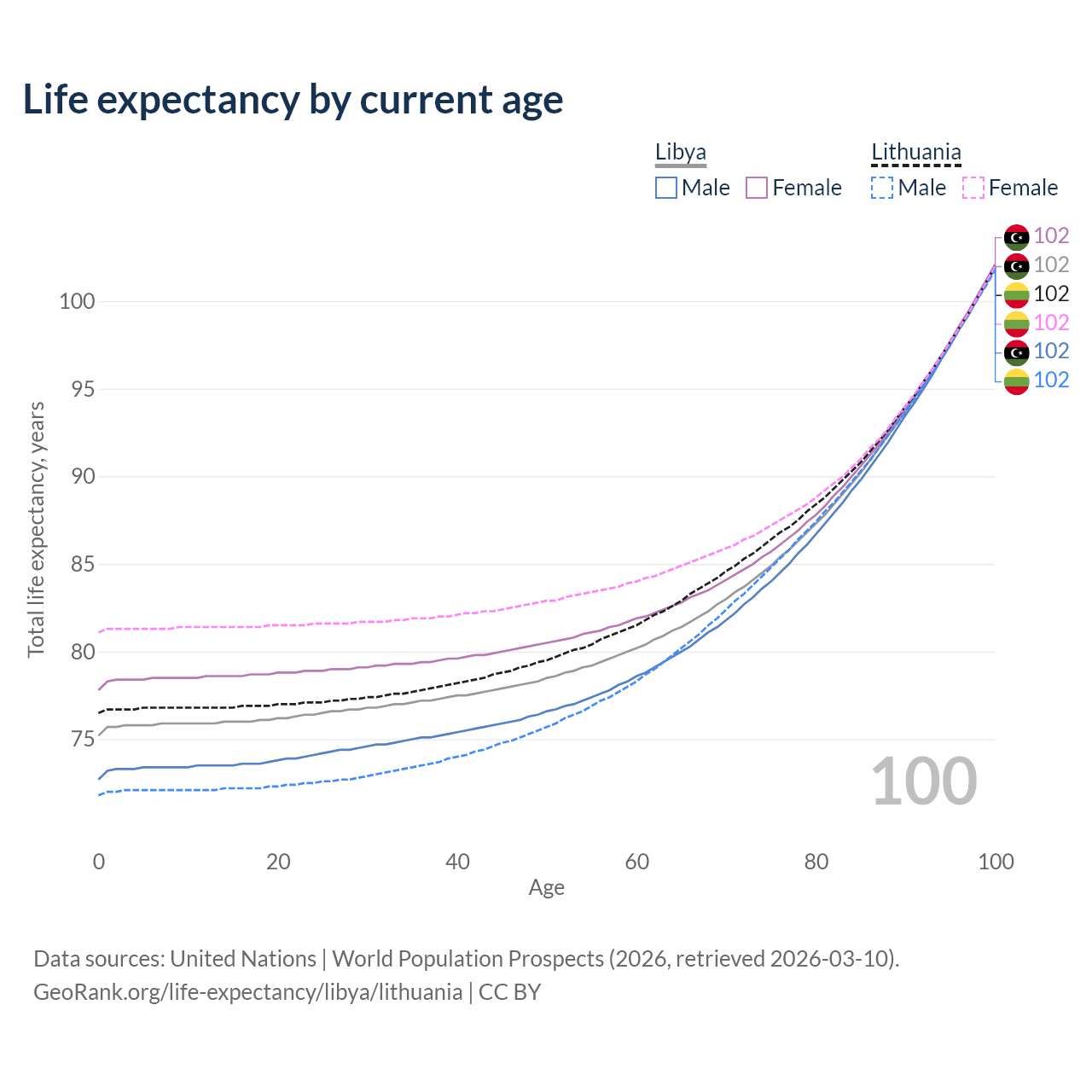 This life expectancy calculator shows the odds of living to 100, 95, 90, and below based on current age for both males and females in Libya and Lithuania, along with mean and median age of death. The calculations are based on the 2026 life tables (actuarial tables) from the UN World Population Prospects.