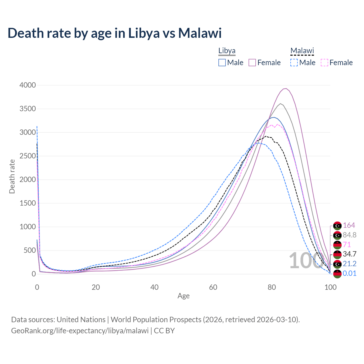 The average life expectancy at birth is 75.2 years in Libya vs 67.9 in Malawi. Libya is ranked 92/197 by life expectancy, and Malawi is 152/197. In Libya, the life expectancy is 72.7 years for males and 77.8 years for females. In Malawi, it's 64.6 years for males and 71.1 years for females.