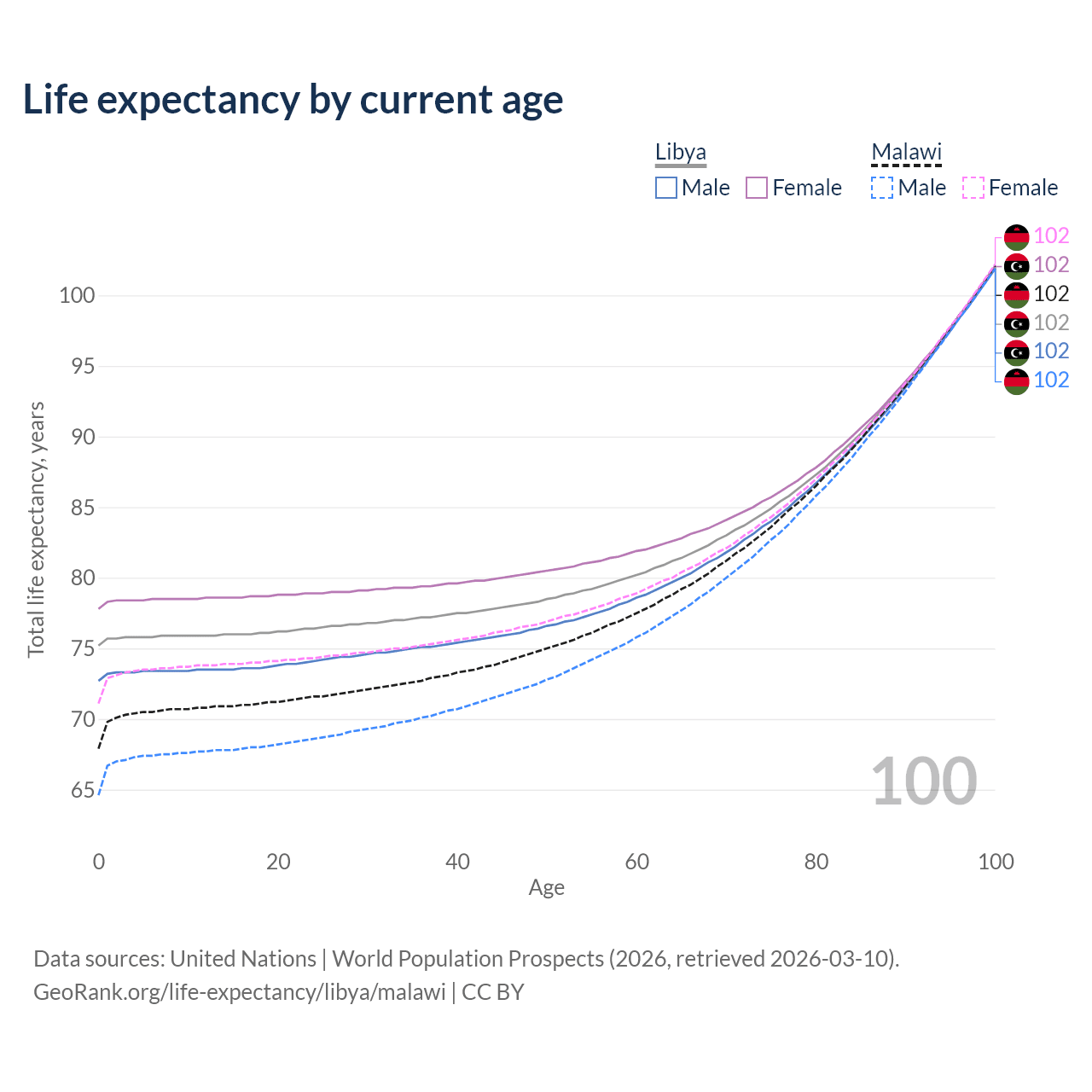This life expectancy calculator shows the odds of living to 100, 95, 90, and below based on current age for both males and females in Libya and Malawi, along with mean and median age of death. The calculations are based on the 2026 life tables (actuarial tables) from the UN World Population Prospects.