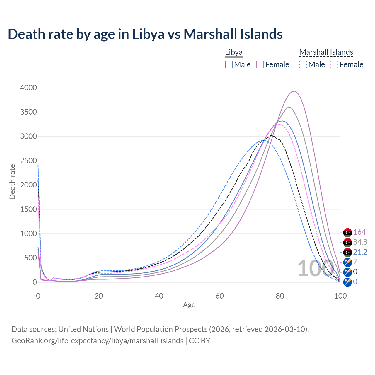 In Libya, the most common age of death is 83, compared to 77 in the Marshall Islands. The median age of death is 78.8 in Libya and 72 in the Marshall Islands, meaning only half of each cohort is expected to live past that age.
