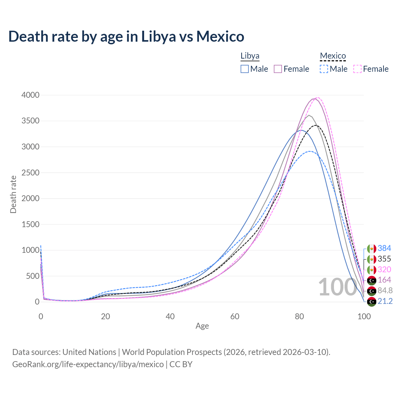 This life expectancy calculator shows the odds of living to 100, 95, 90, and below based on current age for both males and females in Libya and Mexico, along with mean and median age of death. The calculations are based on the 2026 life tables (actuarial tables) from the UN World Population Prospects.