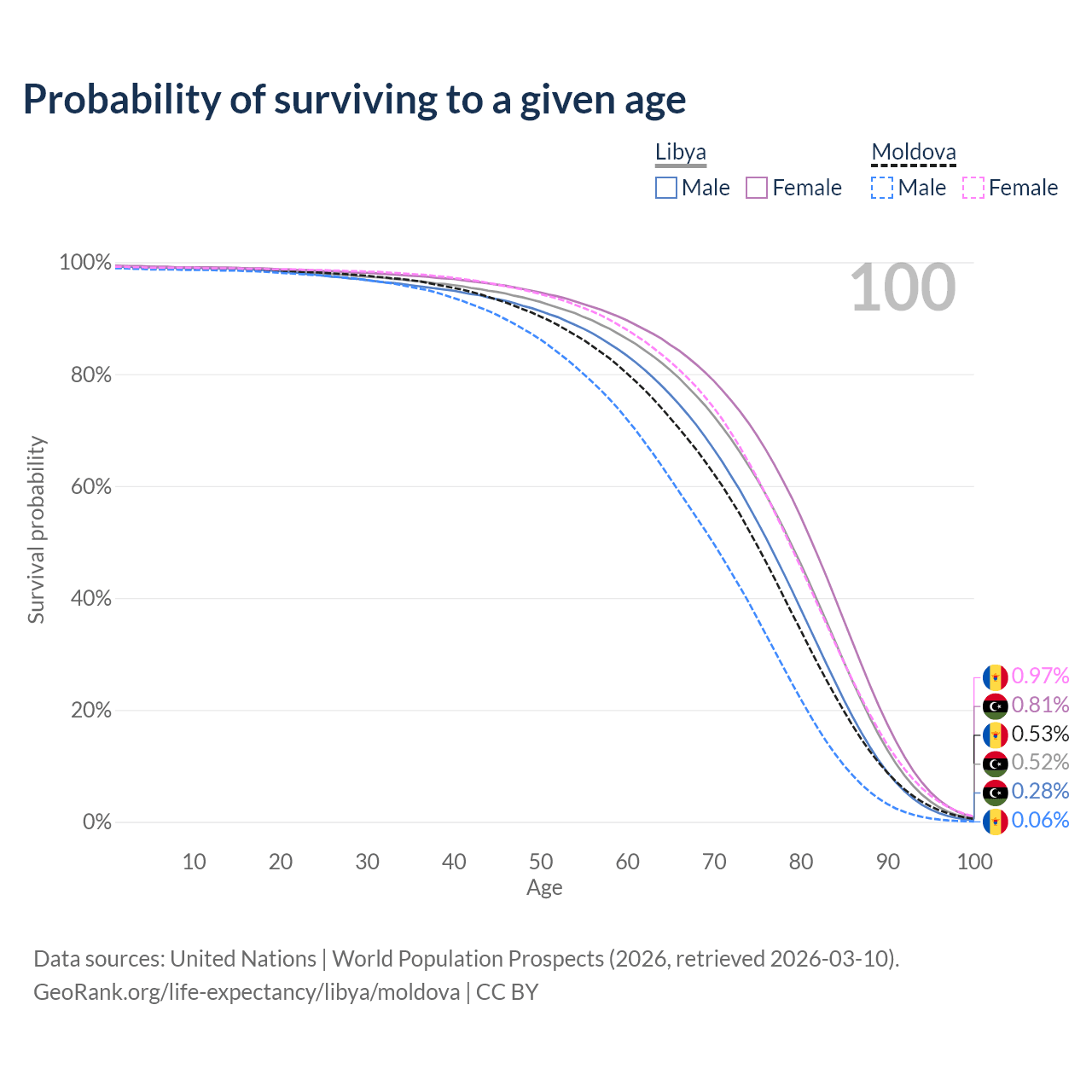 This life expectancy calculator shows the odds of living to 100, 95, 90, and below based on current age for both males and females in Libya and Moldova, along with mean and median age of death. The calculations are based on the 2026 life tables (actuarial tables) from the UN World Population Prospects.