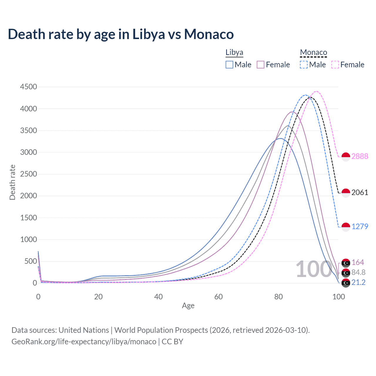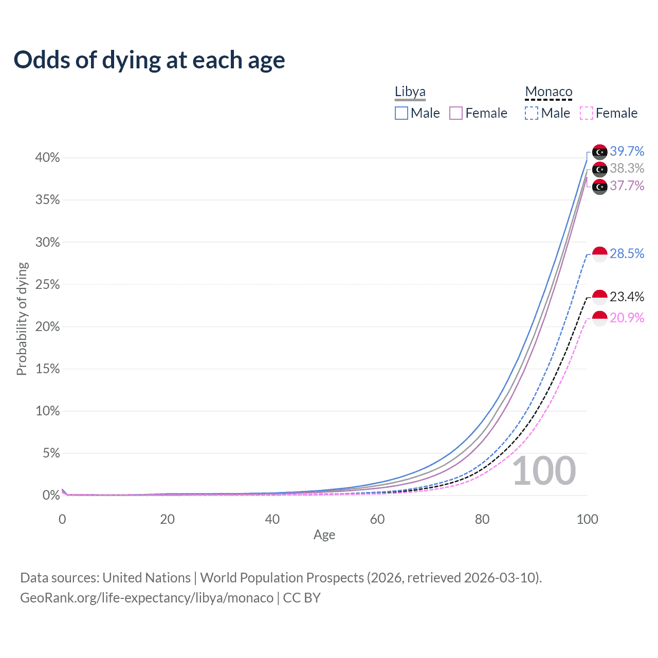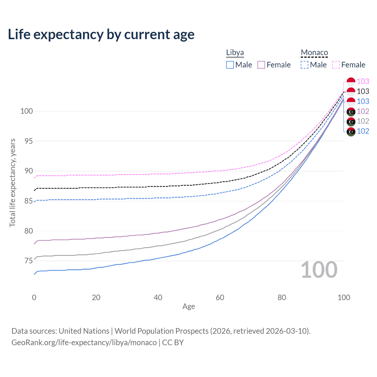 This life expectancy calculator shows the odds of living to 100, 95, 90, and below based on current age for both males and females in Libya and Monaco, along with mean and median age of death. The calculations are based on the 2026 life tables (actuarial tables) from the UN World Population Prospects.