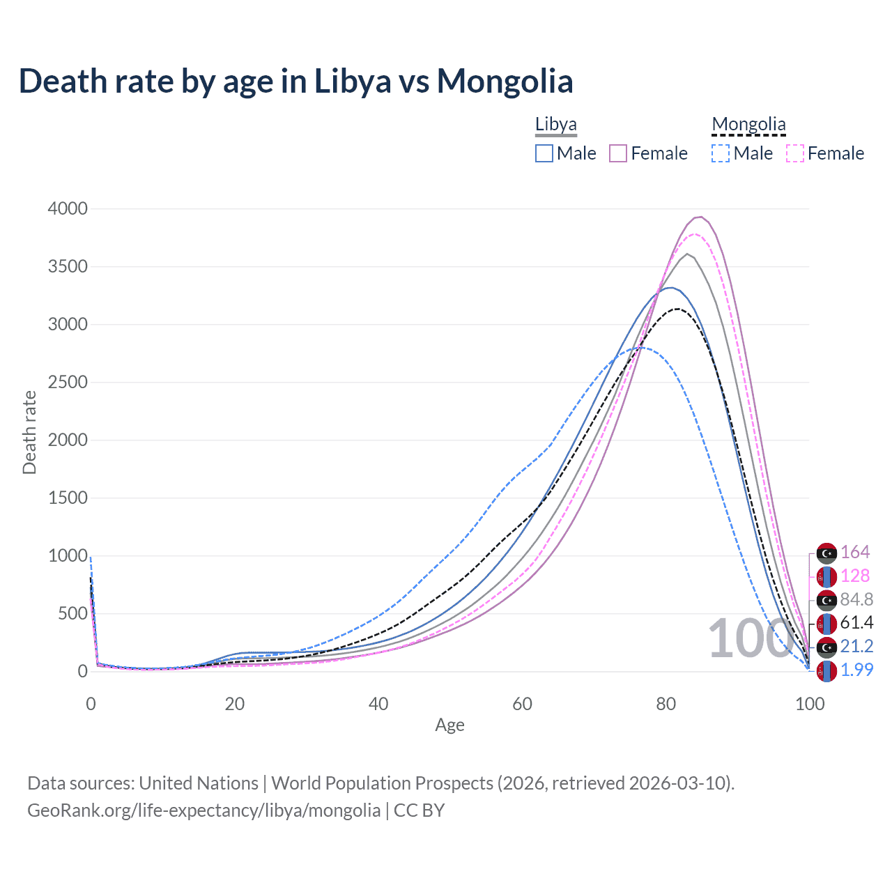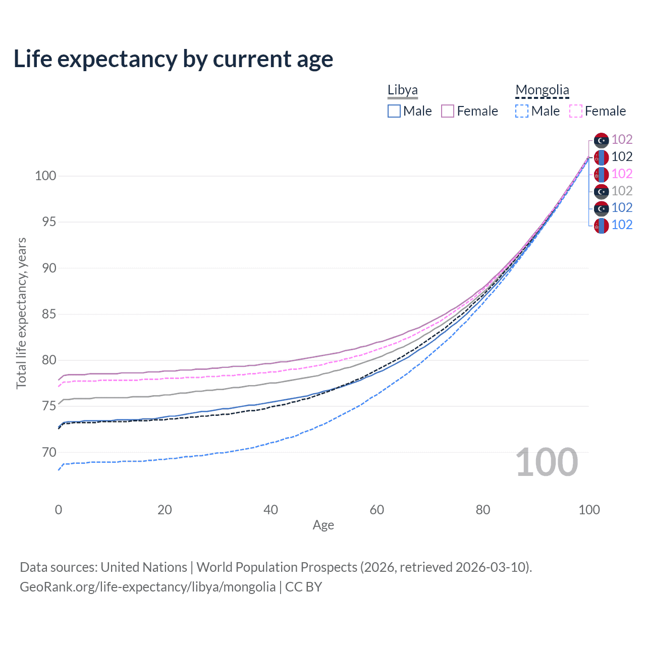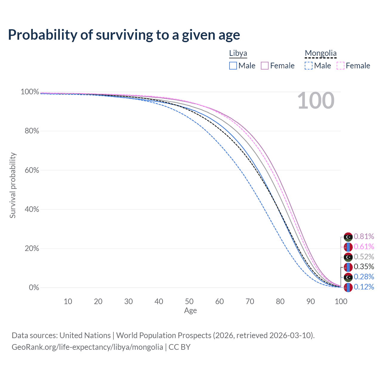 This life expectancy calculator shows the odds of living to 100, 95, 90, and below based on current age for both males and females in Libya and Mongolia, along with mean and median age of death. The calculations are based on the 2026 life tables (actuarial tables) from the UN World Population Prospects.