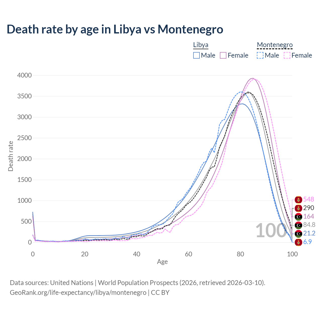 This life expectancy calculator shows the odds of living to 100, 95, 90, and below based on current age for both males and females in Libya and Montenegro, along with mean and median age of death. The calculations are based on the 2026 life tables (actuarial tables) from the UN World Population Prospects.