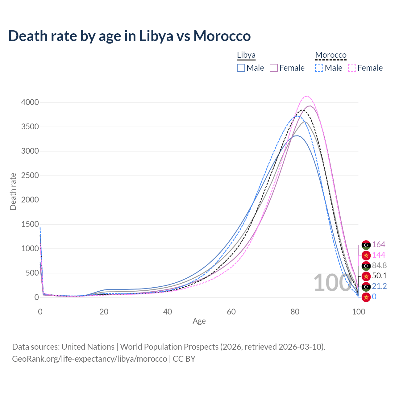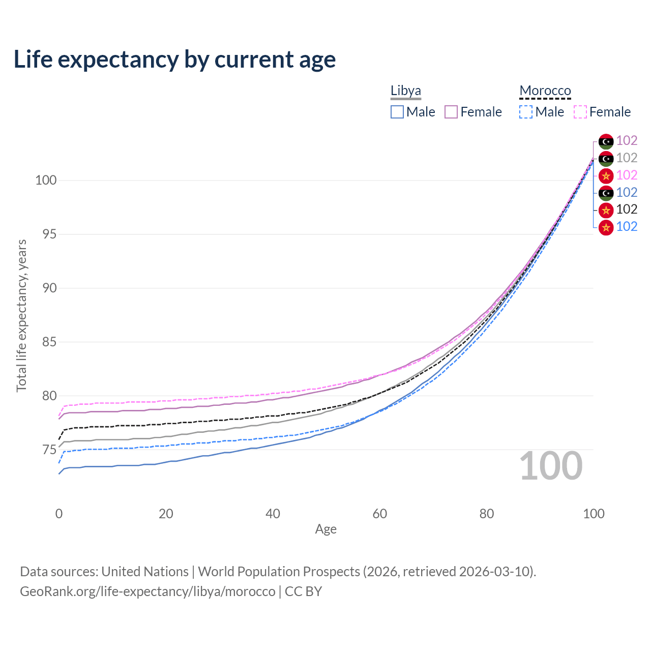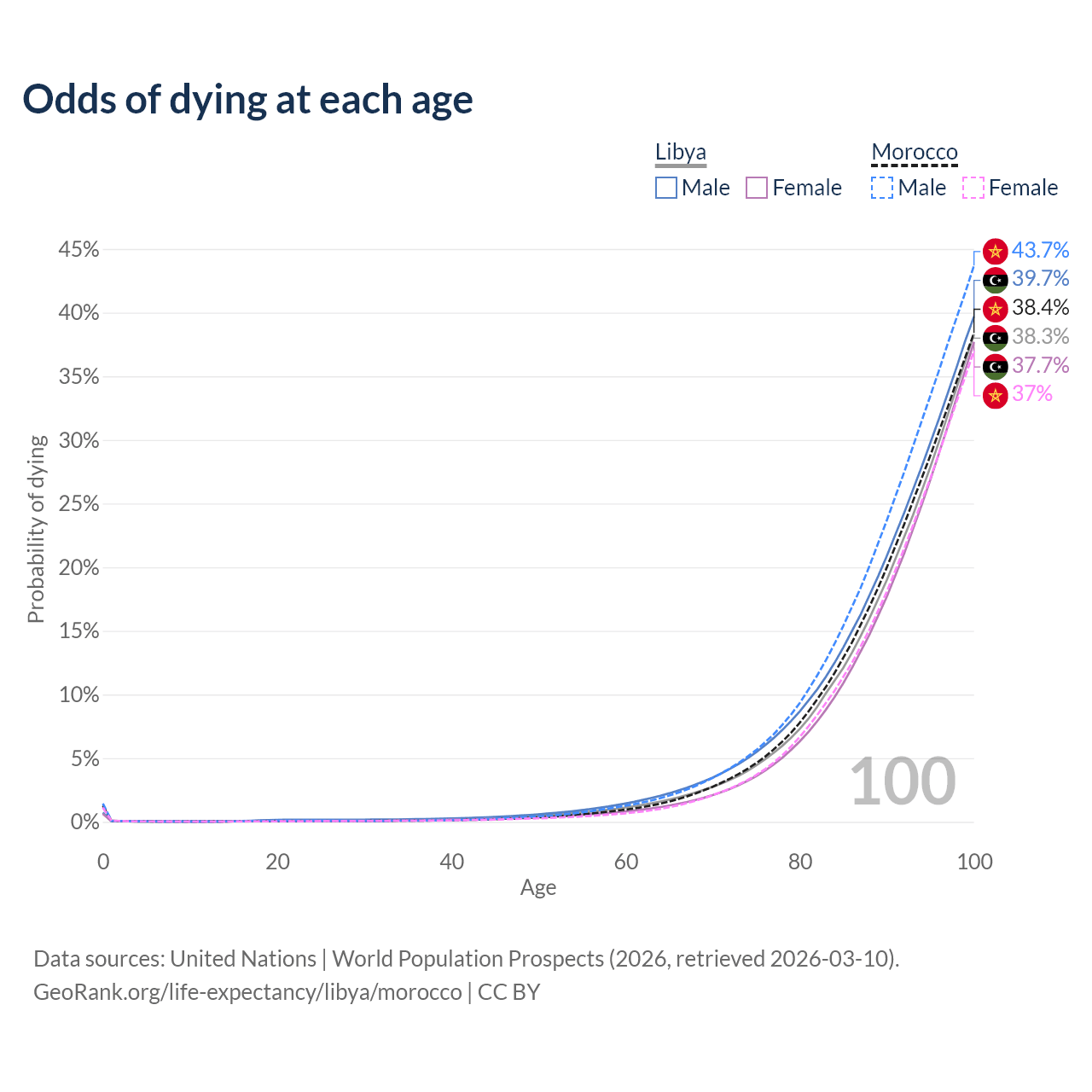 This life expectancy calculator shows the odds of living to 100, 95, 90, and below based on current age for both males and females in Libya and Morocco, along with mean and median age of death. The calculations are based on the 2026 life tables (actuarial tables) from the UN World Population Prospects.