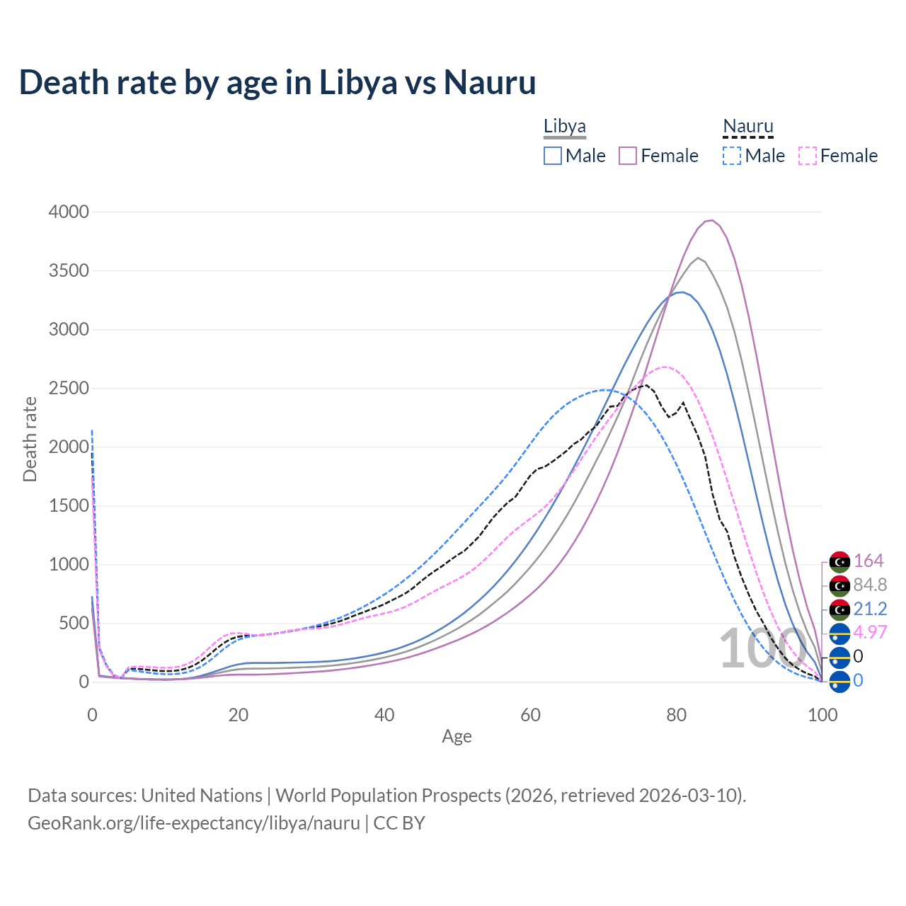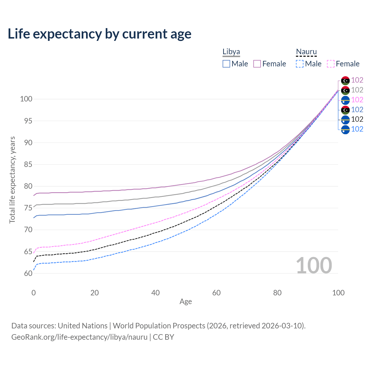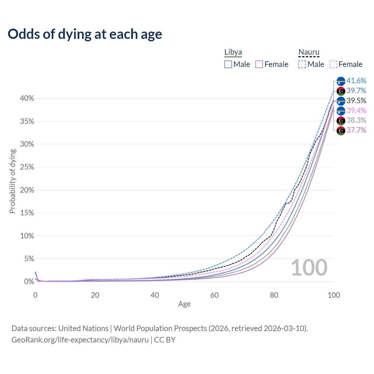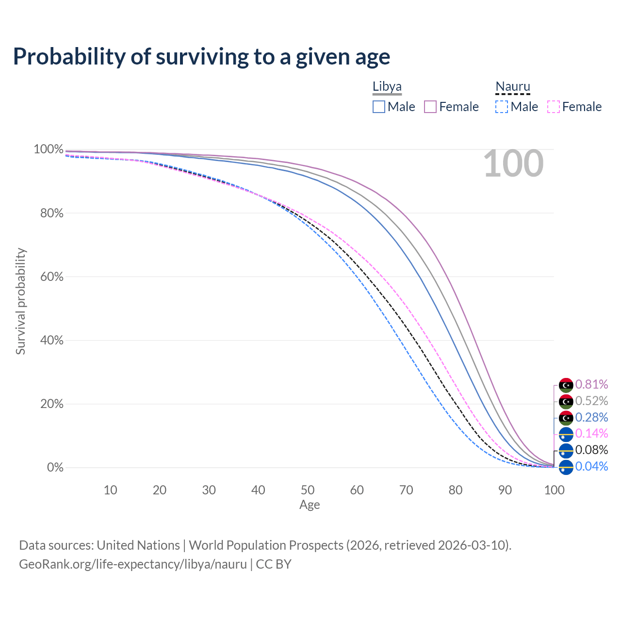 This life expectancy calculator shows the odds of living to 100, 95, 90, and below based on current age for both males and females in Libya and Nauru, along with mean and median age of death. The calculations are based on the 2026 life tables (actuarial tables) from the UN World Population Prospects.