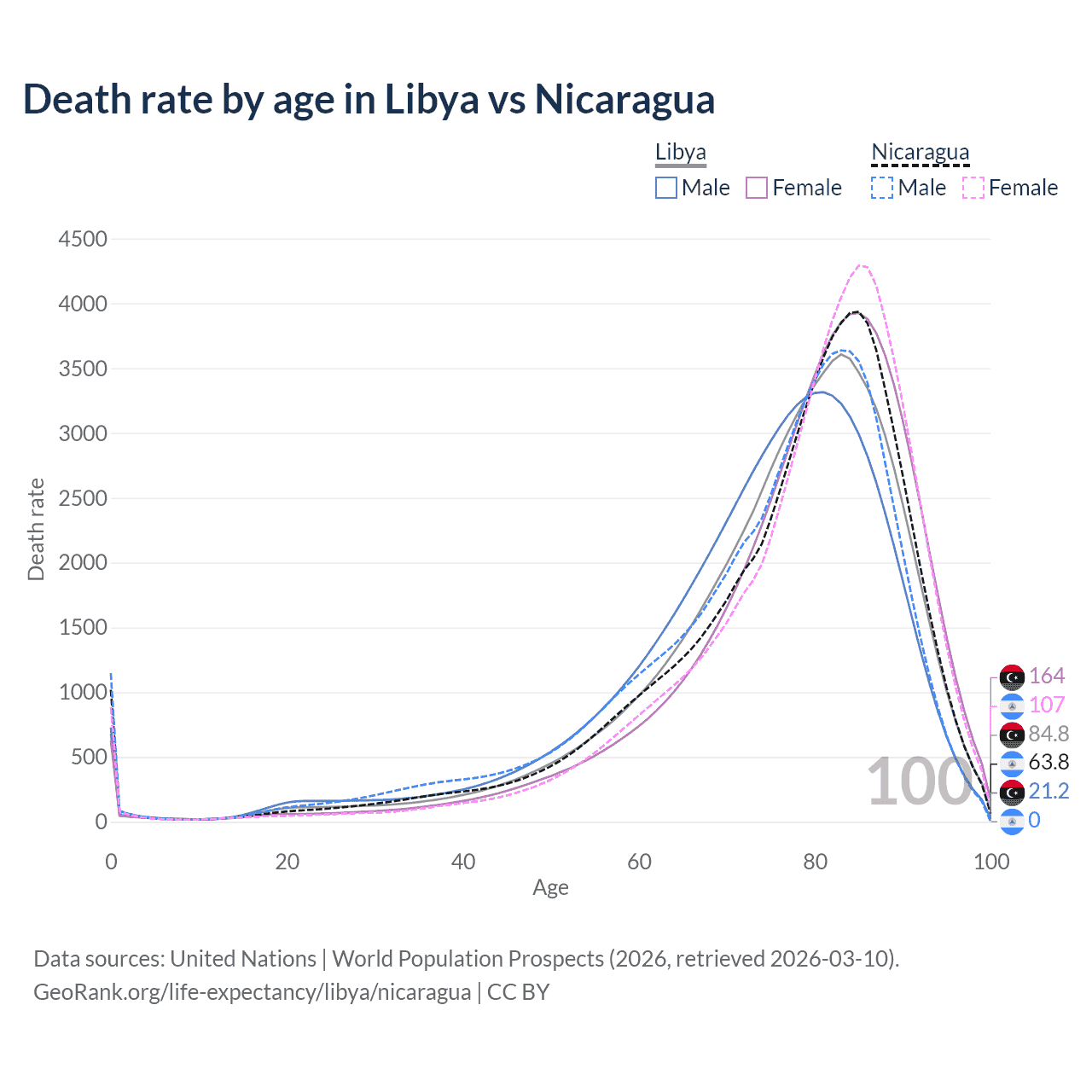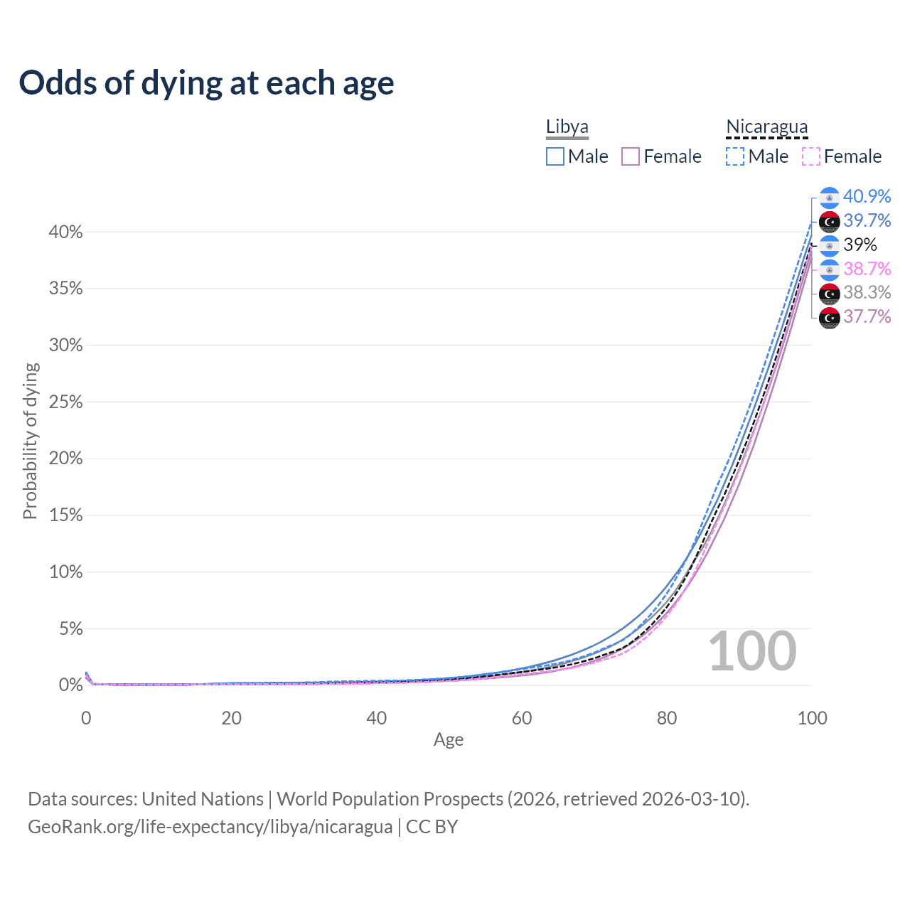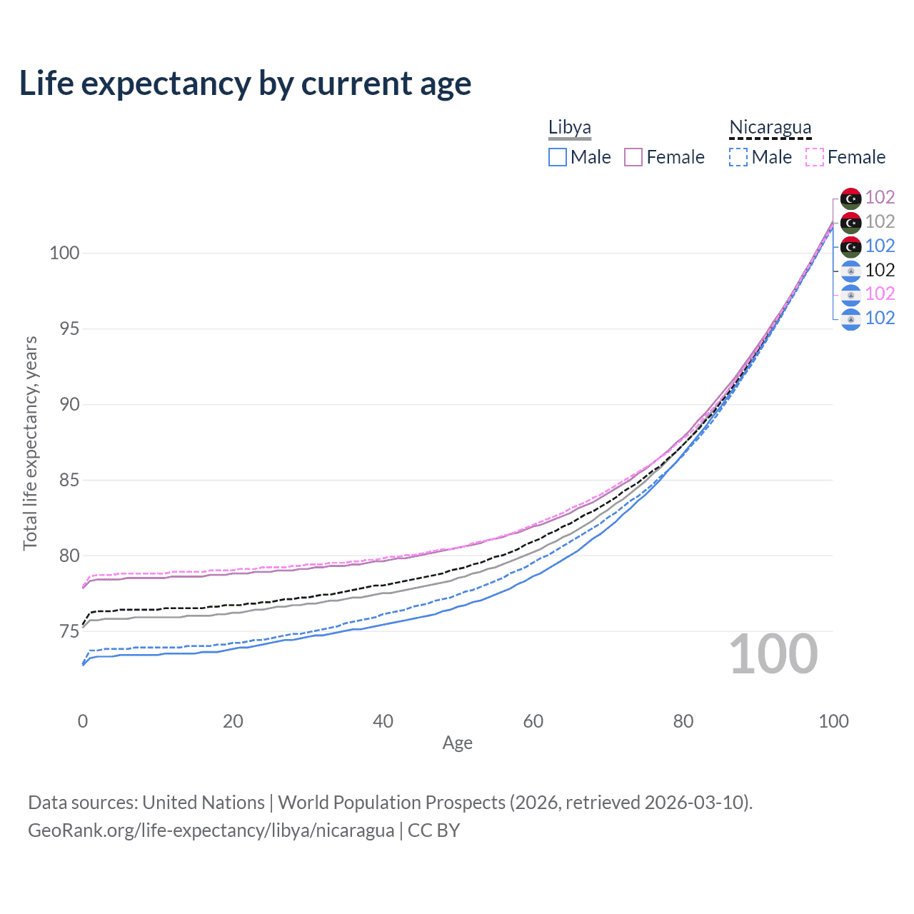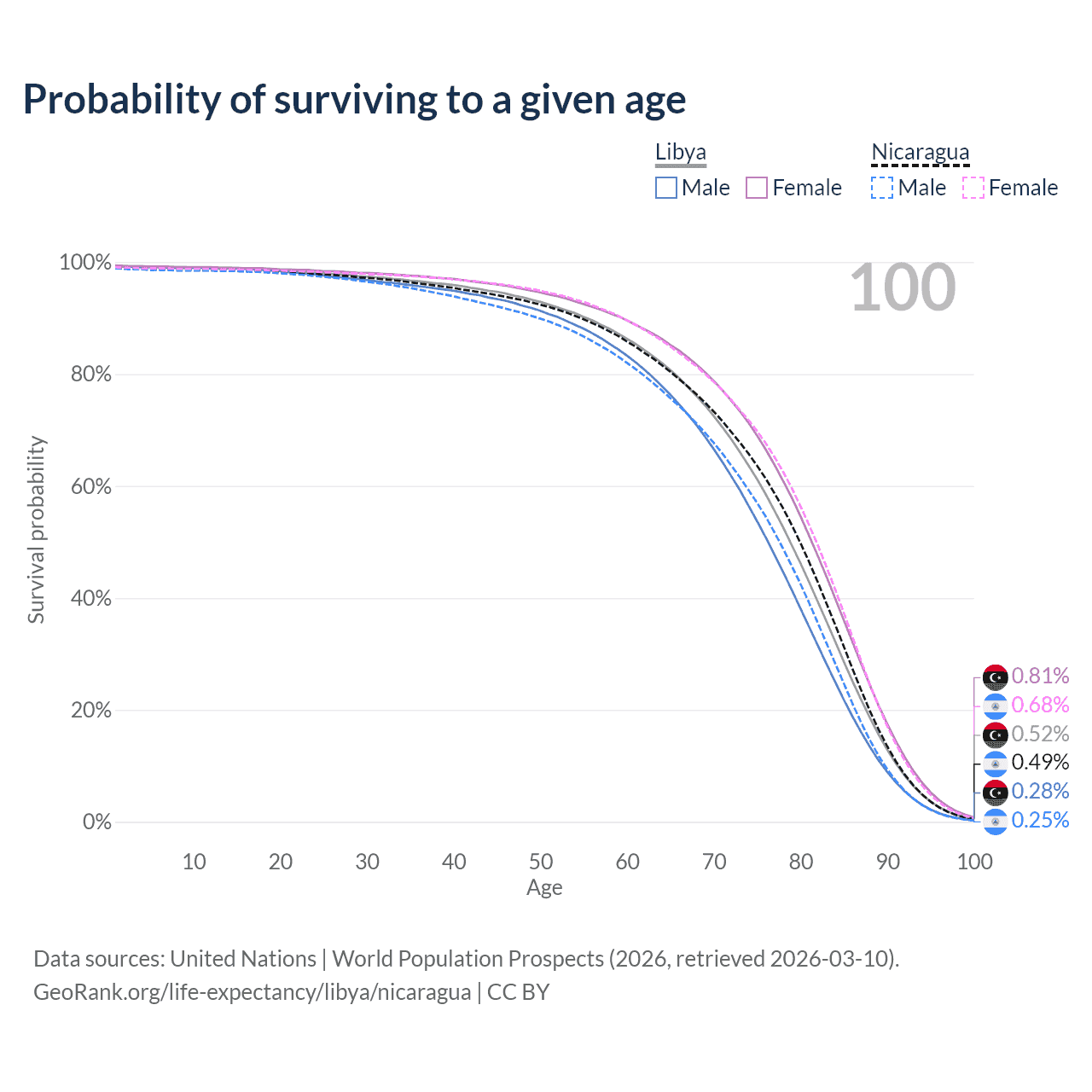 This life expectancy calculator shows the odds of living to 100, 95, 90, and below based on current age for both males and females in Libya and Nicaragua, along with mean and median age of death. The calculations are based on the 2026 life tables (actuarial tables) from the UN World Population Prospects.