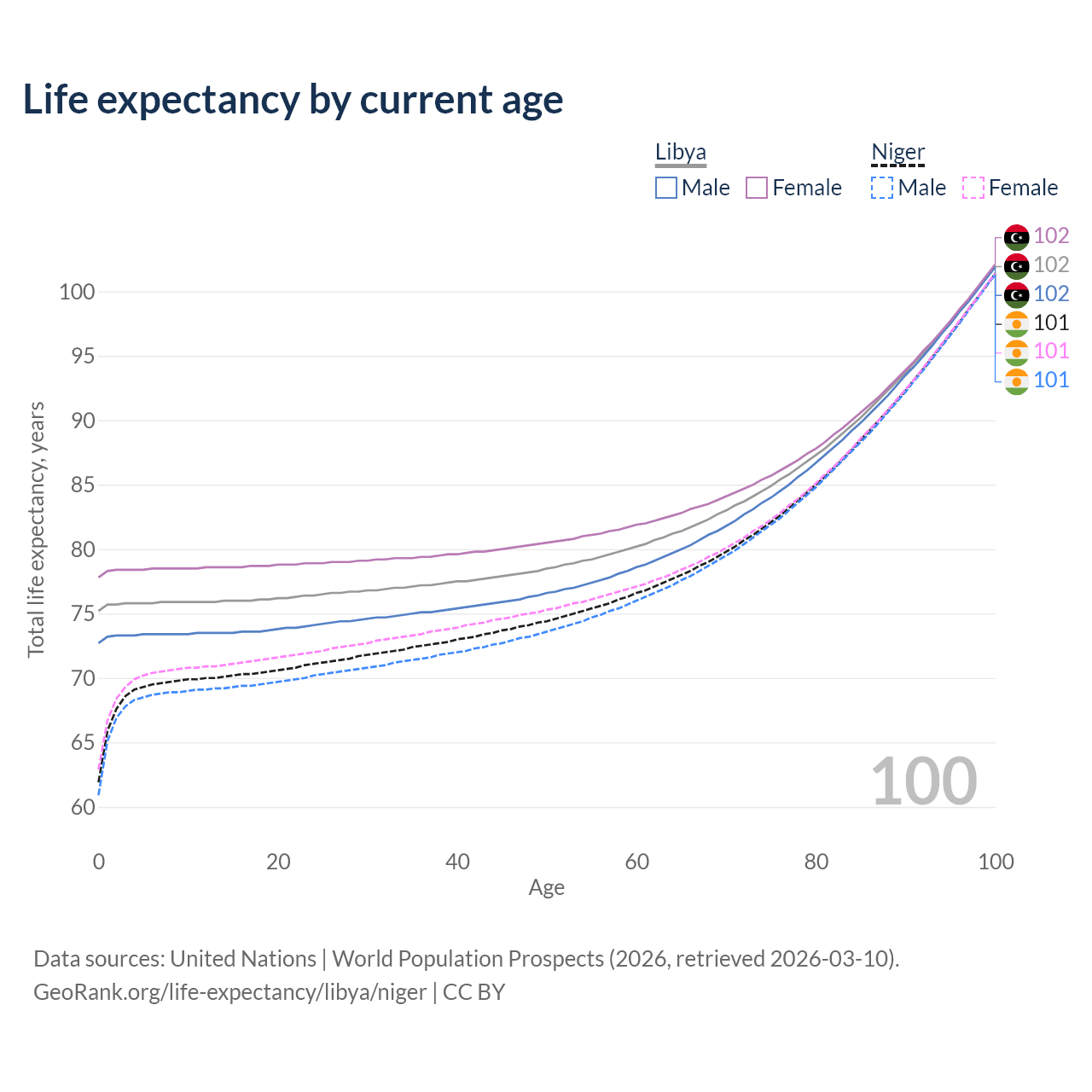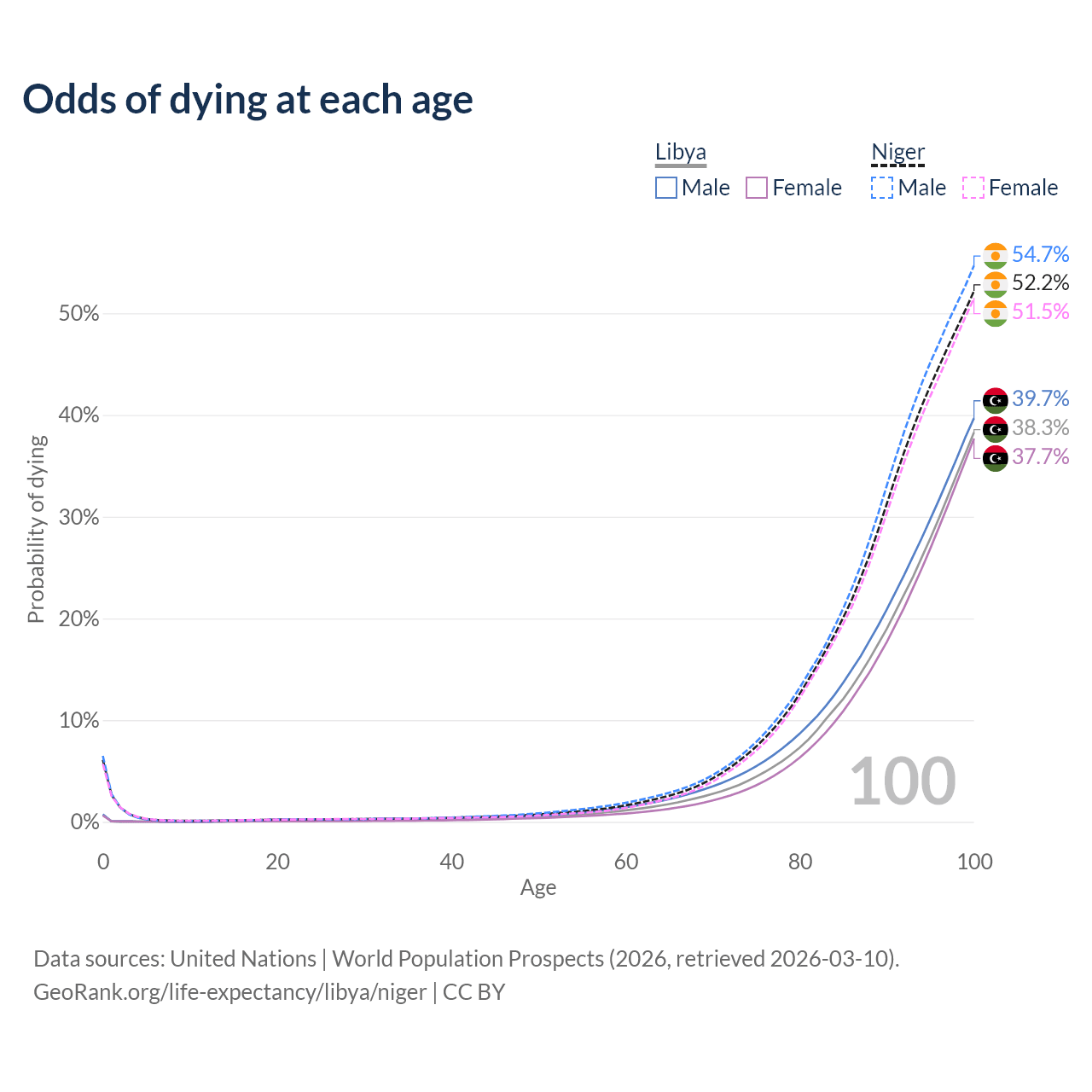 This life expectancy calculator shows the odds of living to 100, 95, 90, and below based on current age for both males and females in Libya and Niger, along with mean and median age of death. The calculations are based on the 2026 life tables (actuarial tables) from the UN World Population Prospects.