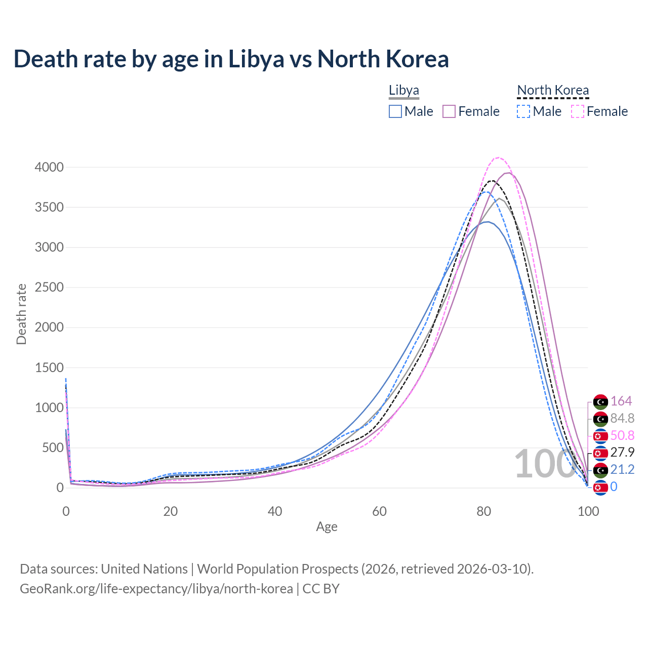 This life expectancy calculator shows the odds of living to 100, 95, 90, and below based on current age for both males and females in Libya and North Korea, along with mean and median age of death. The calculations are based on the 2026 life tables (actuarial tables) from the UN World Population Prospects.