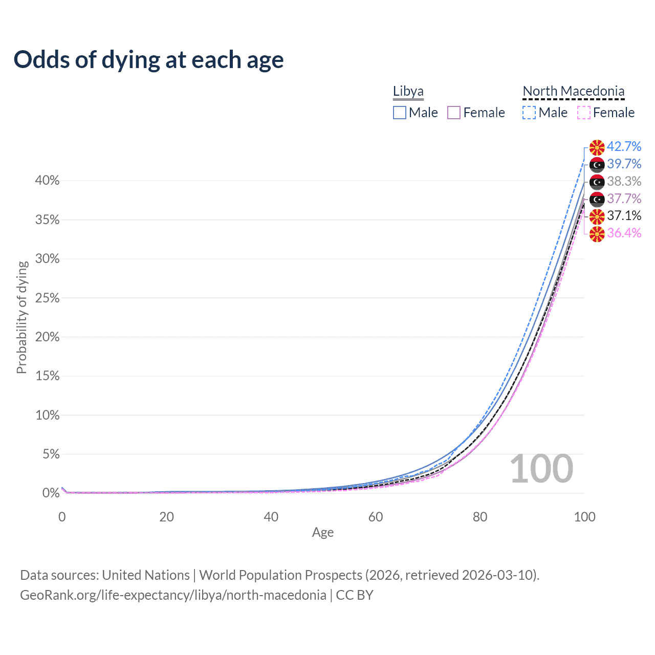 This life expectancy calculator shows the odds of living to 100, 95, 90, and below based on current age for both males and females in Libya and North Macedonia, along with mean and median age of death. The calculations are based on the 2026 life tables (actuarial tables) from the UN World Population Prospects.