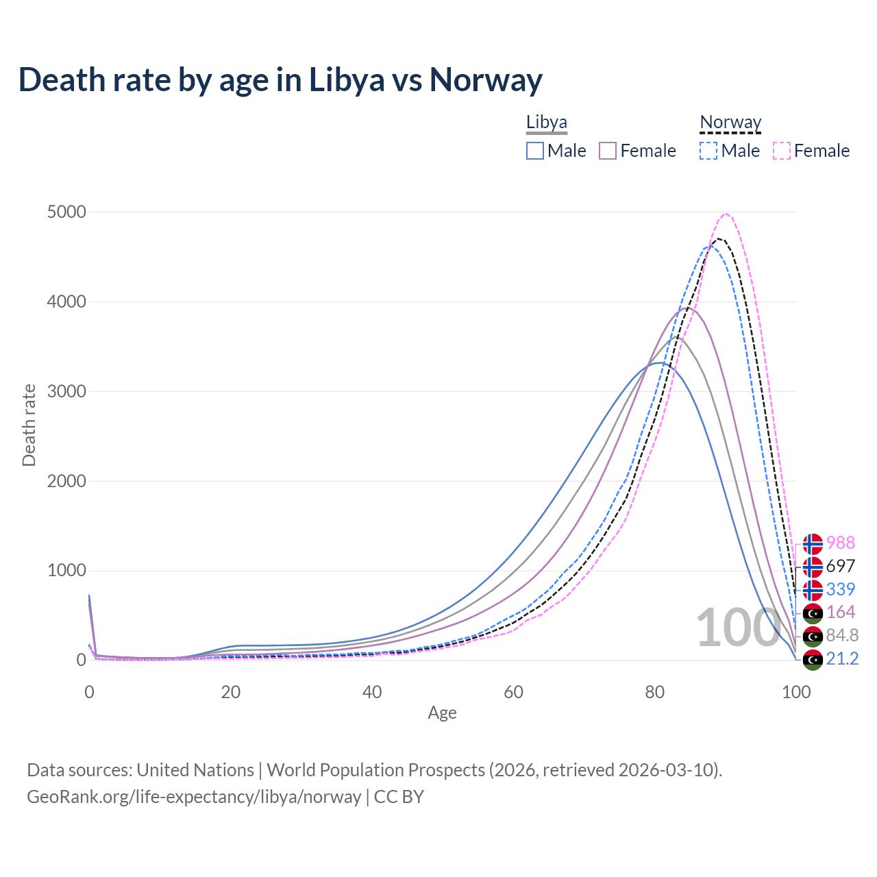 This life expectancy calculator shows the odds of living to 100, 95, 90, and below based on current age for both males and females in Libya and Norway, along with mean and median age of death. The calculations are based on the 2026 life tables (actuarial tables) from the UN World Population Prospects.