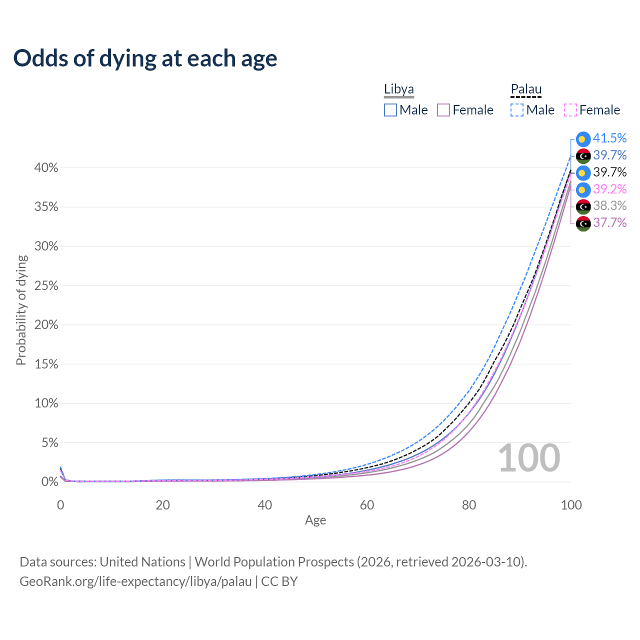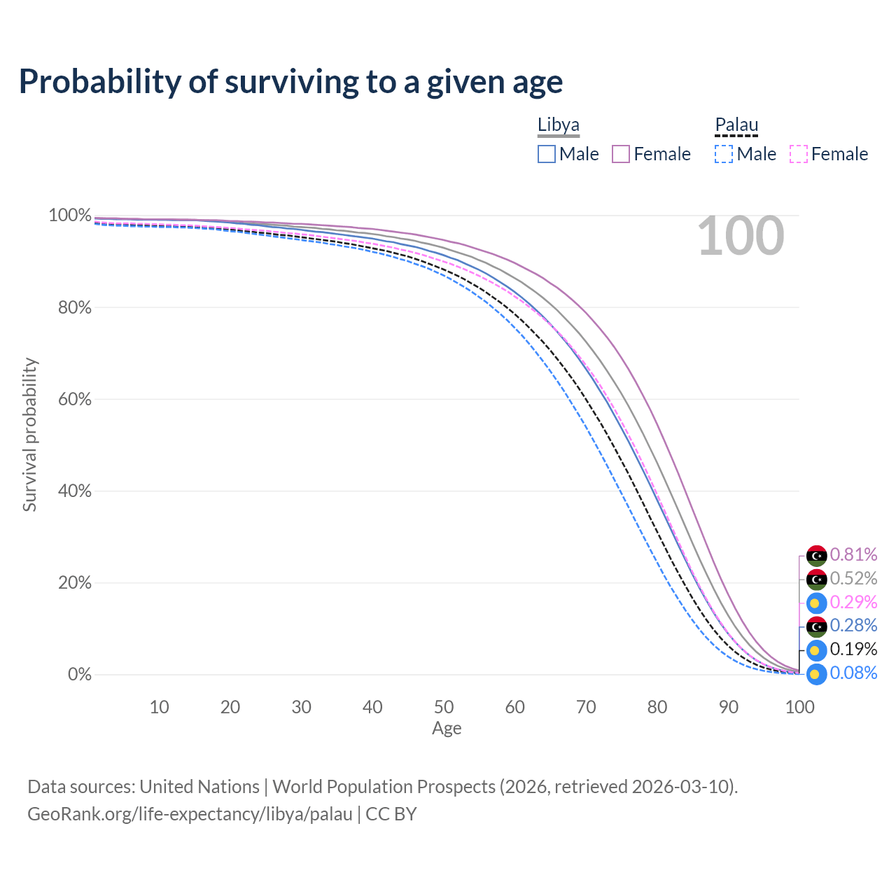 This life expectancy calculator shows the odds of living to 100, 95, 90, and below based on current age for both males and females in Libya and Palau, along with mean and median age of death. The calculations are based on the 2026 life tables (actuarial tables) from the UN World Population Prospects.