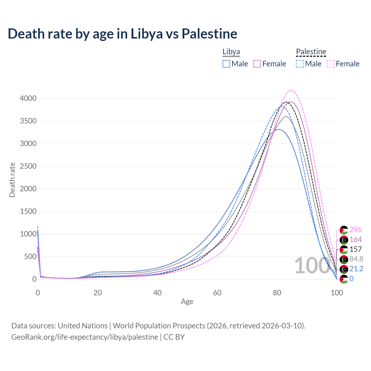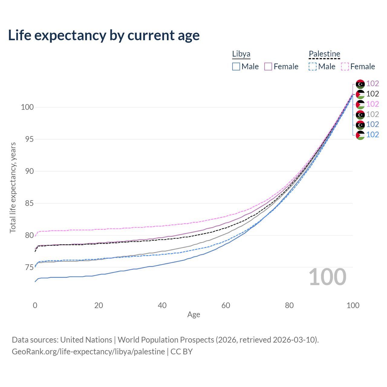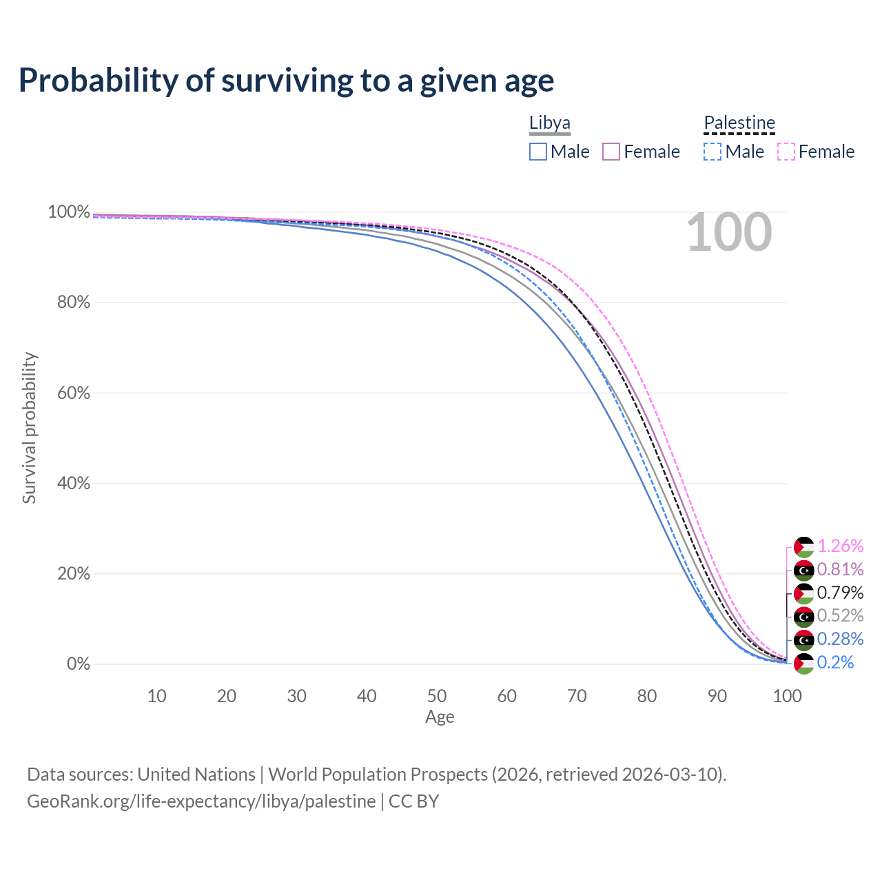 This life expectancy calculator shows the odds of living to 100, 95, 90, and below based on current age for both males and females in Libya and Palestine, along with mean and median age of death. The calculations are based on the 2026 life tables (actuarial tables) from the UN World Population Prospects.