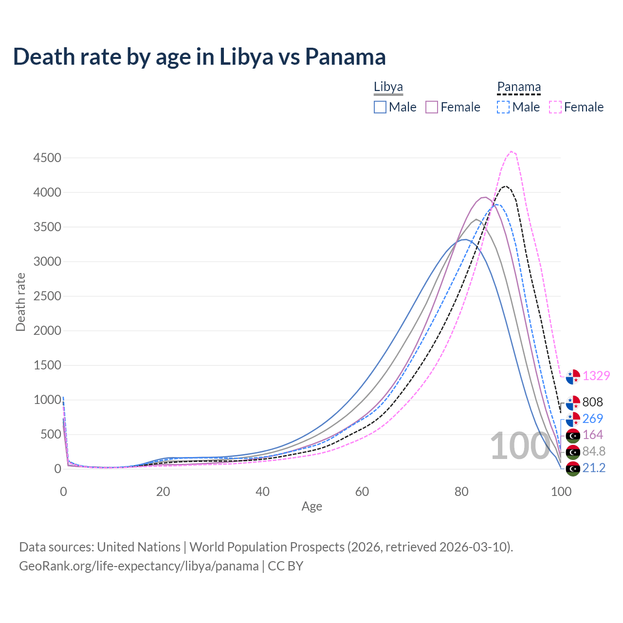 In Libya, the most common age of death is 83, compared to 89 in Panama. The median age of death is 78.8 in Libya and 84.6 in Panama, meaning only half of each cohort is expected to live past that age.
