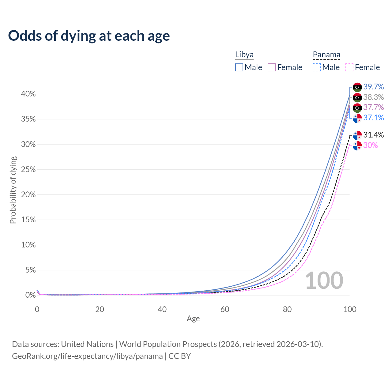 This life expectancy calculator shows the odds of living to 100, 95, 90, and below based on current age for both males and females in Libya and Panama, along with mean and median age of death. The calculations are based on the 2026 life tables (actuarial tables) from the UN World Population Prospects.