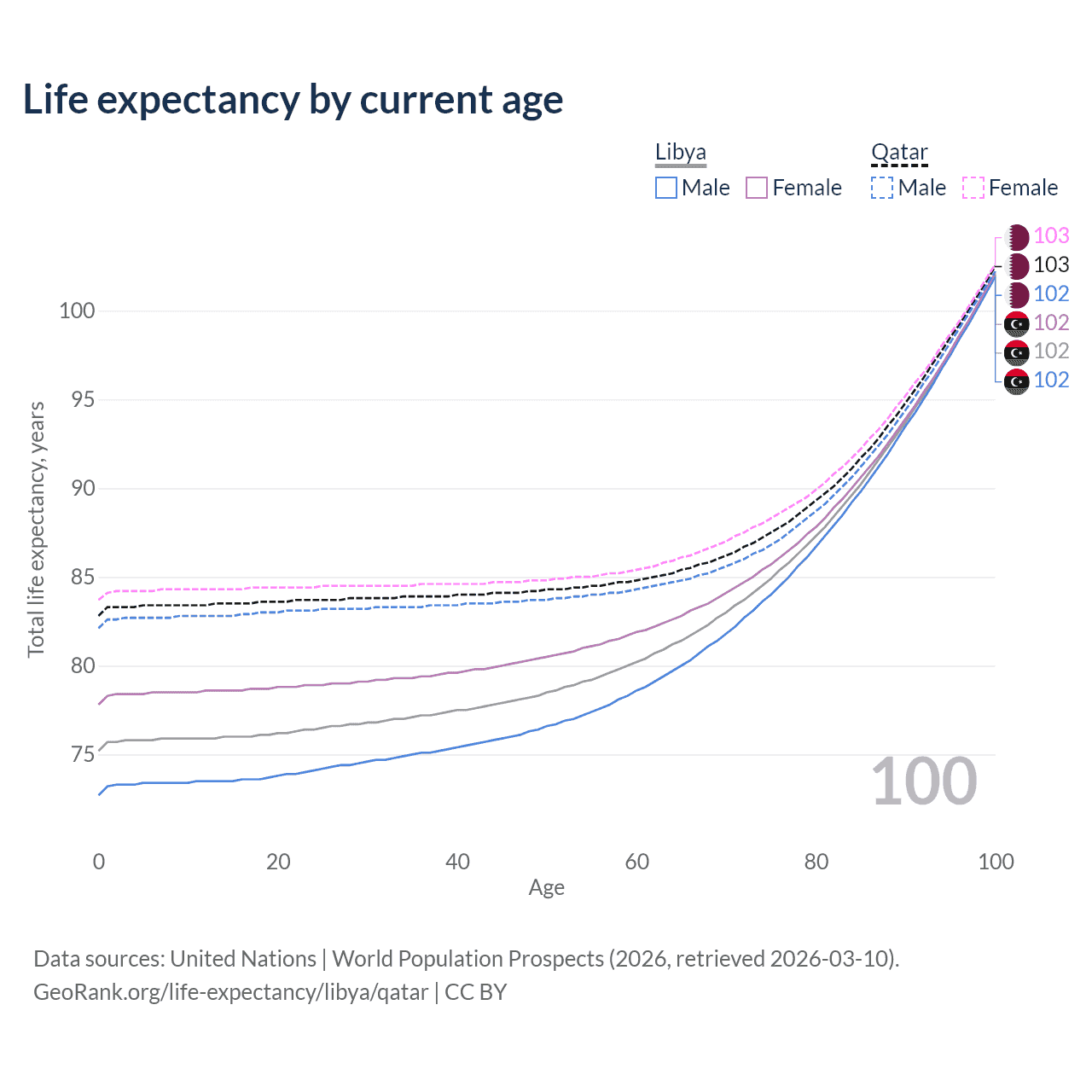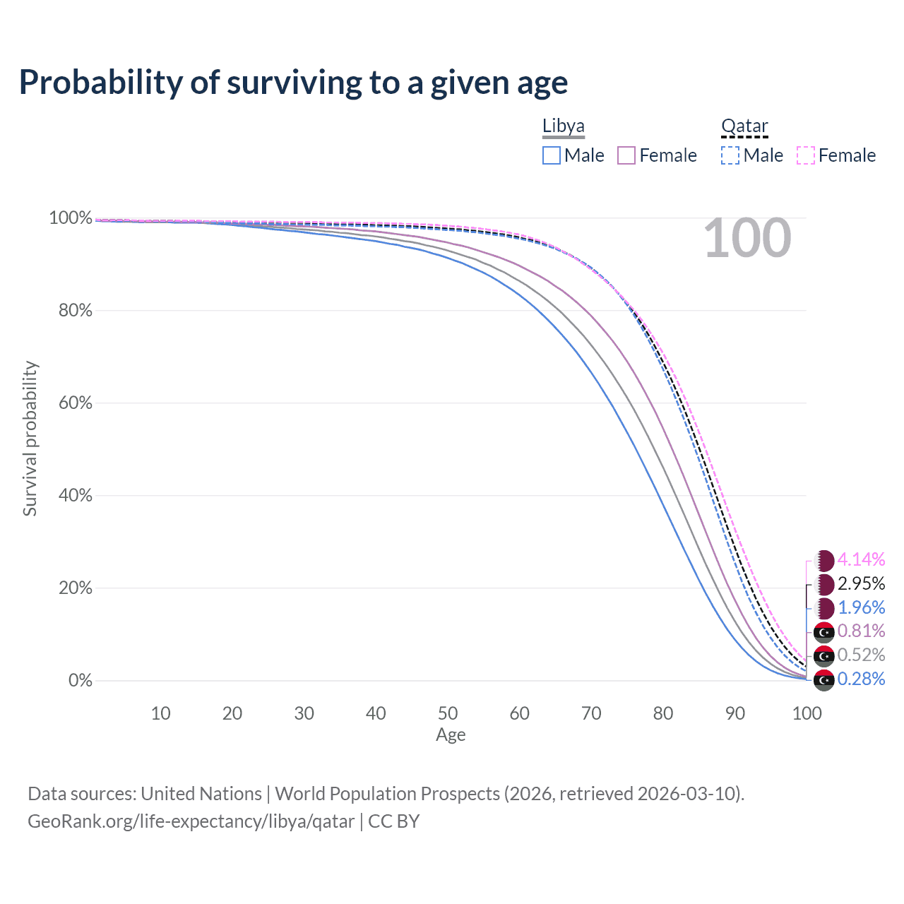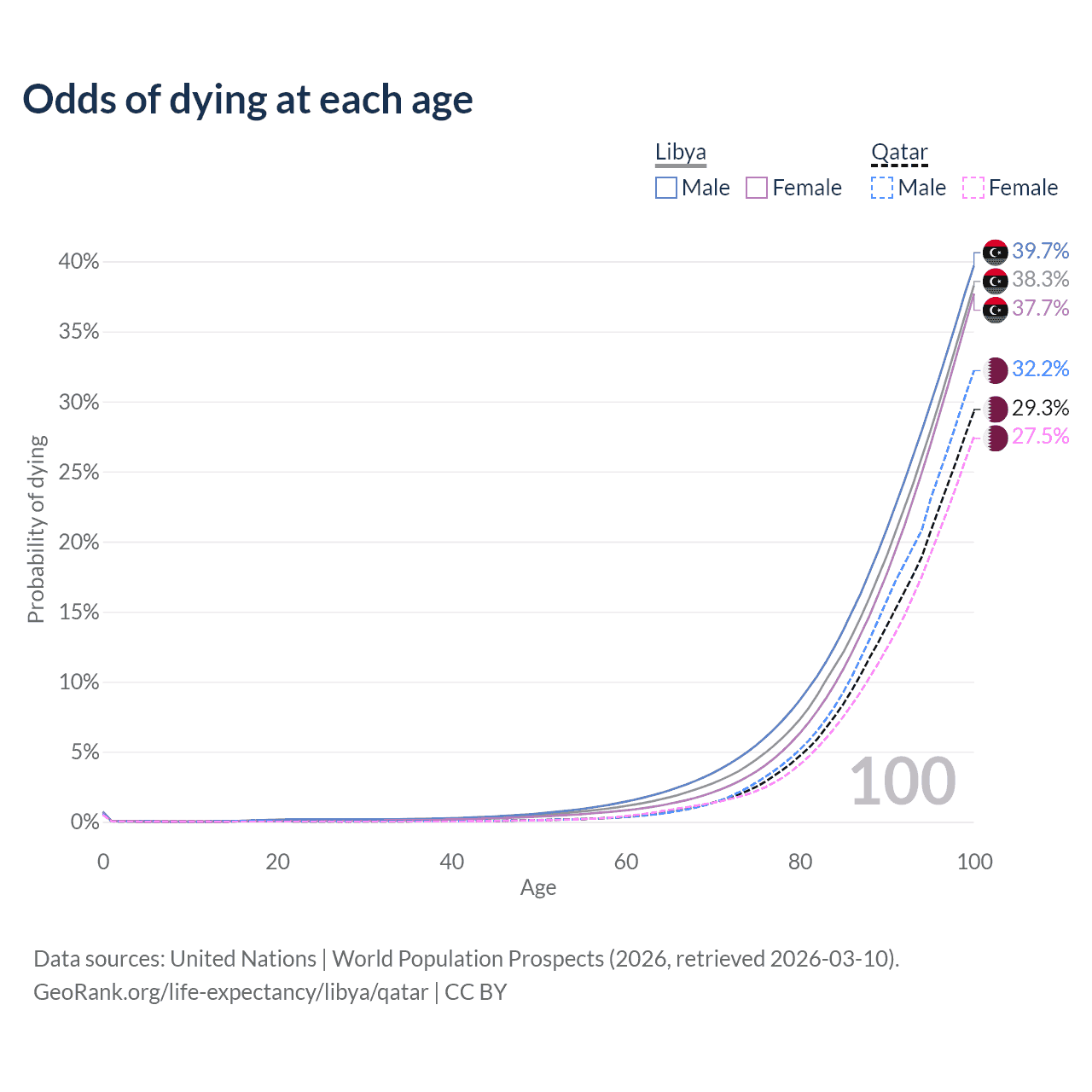 This life expectancy calculator shows the odds of living to 100, 95, 90, and below based on current age for both males and females in Libya and Qatar, along with mean and median age of death. The calculations are based on the 2026 life tables (actuarial tables) from the UN World Population Prospects.