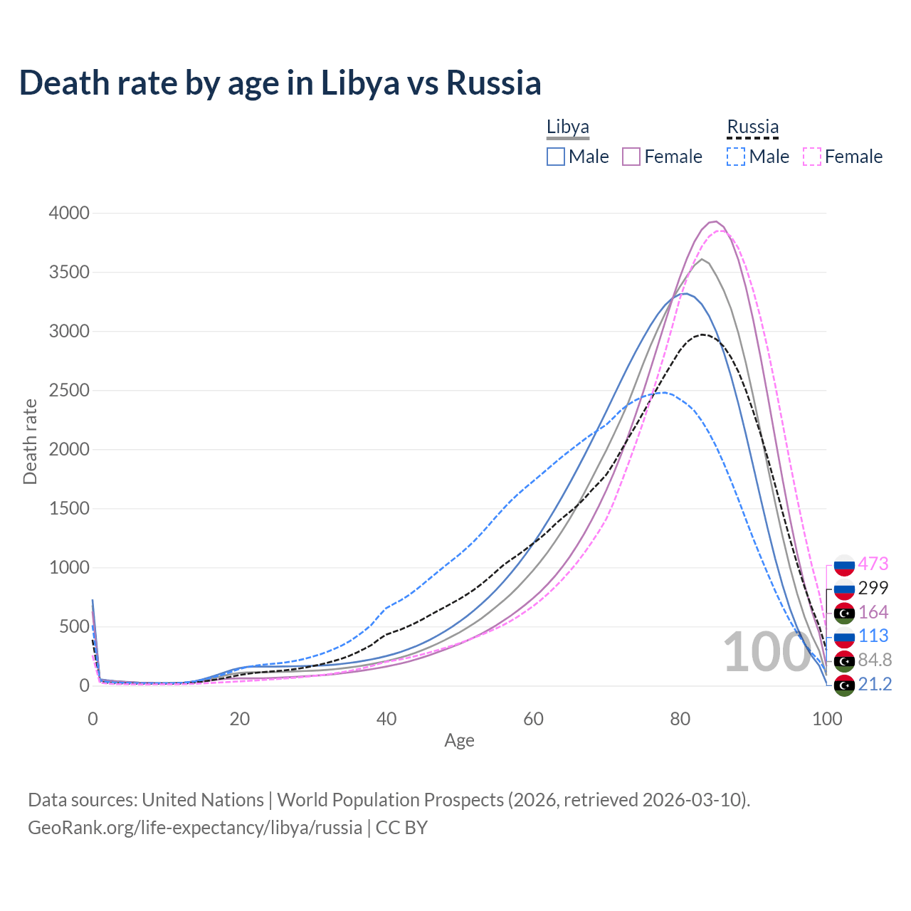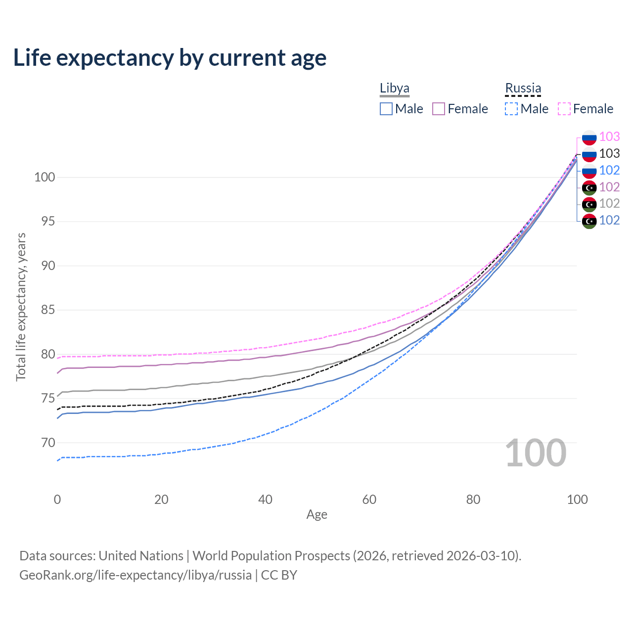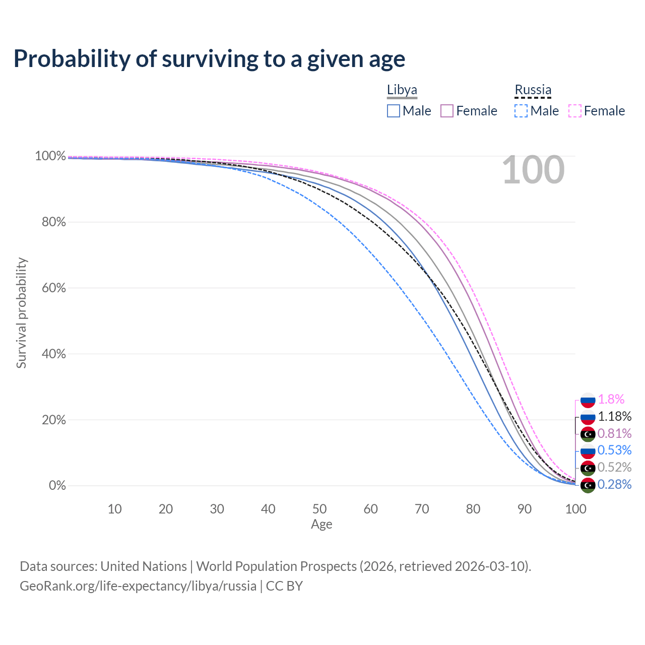 This life expectancy calculator shows the odds of living to 100, 95, 90, and below based on current age for both males and females in Libya and Russia, along with mean and median age of death. The calculations are based on the 2026 life tables (actuarial tables) from the UN World Population Prospects.
