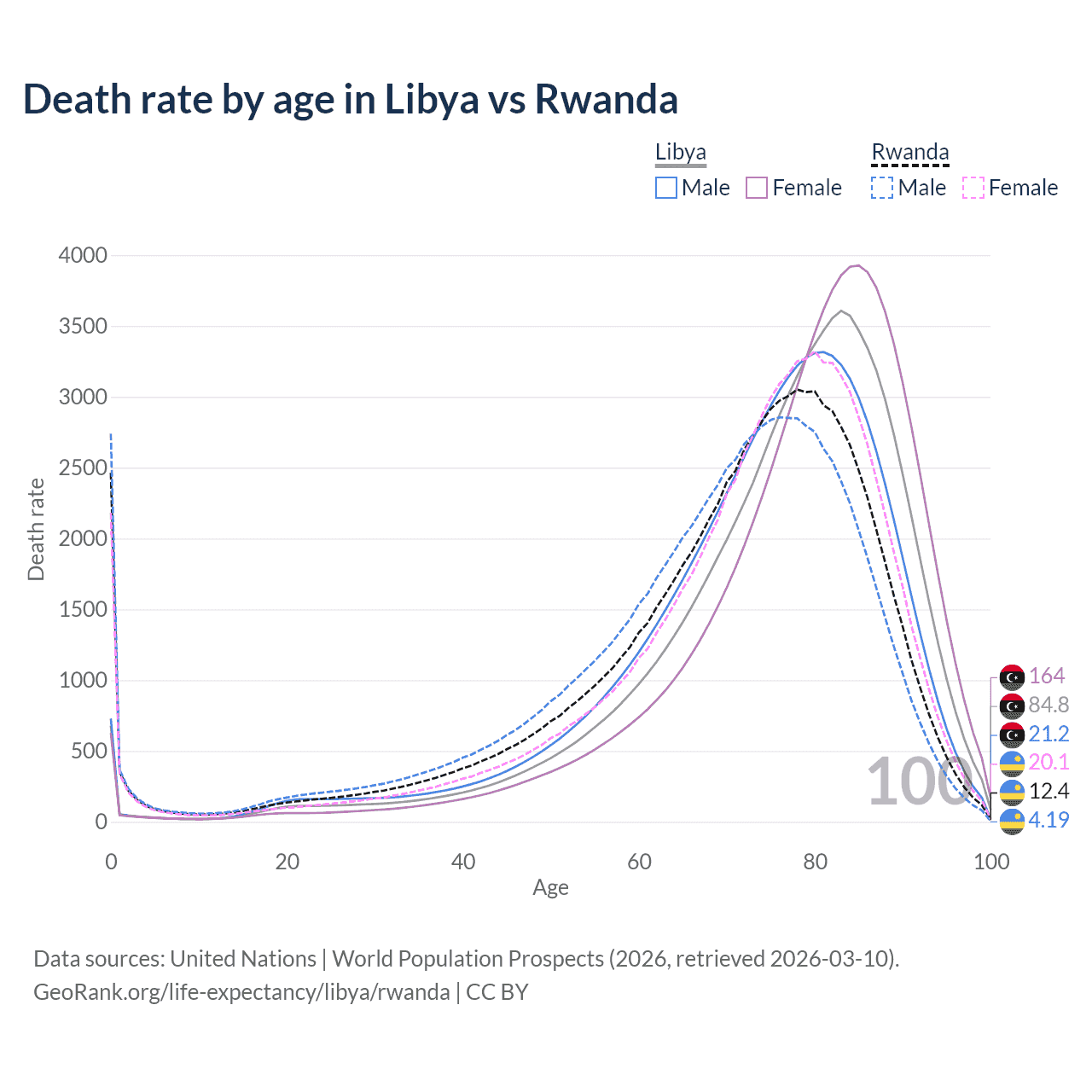 In Libya, the most common age of death is 83, compared to 78 in Rwanda. The median age of death is 78.8 in Libya and 73.5 in Rwanda, meaning only half of each cohort is expected to live past that age.