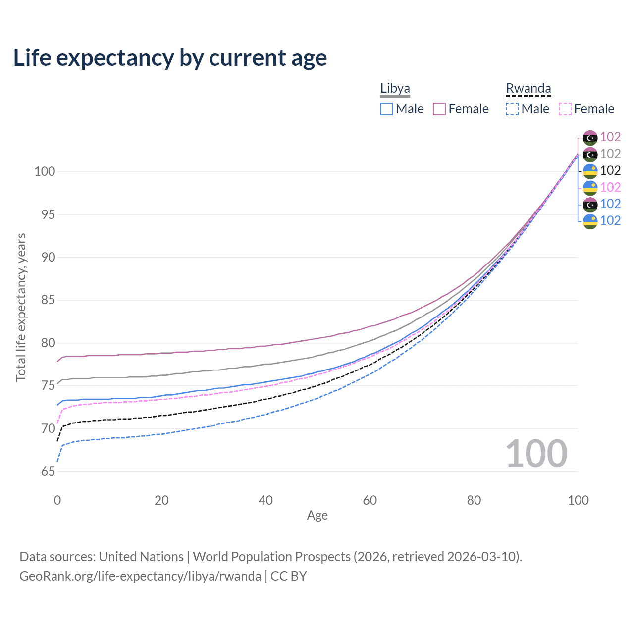 This life expectancy calculator shows the odds of living to 100, 95, 90, and below based on current age for both males and females in Libya and Rwanda, along with mean and median age of death. The calculations are based on the 2026 life tables (actuarial tables) from the UN World Population Prospects.