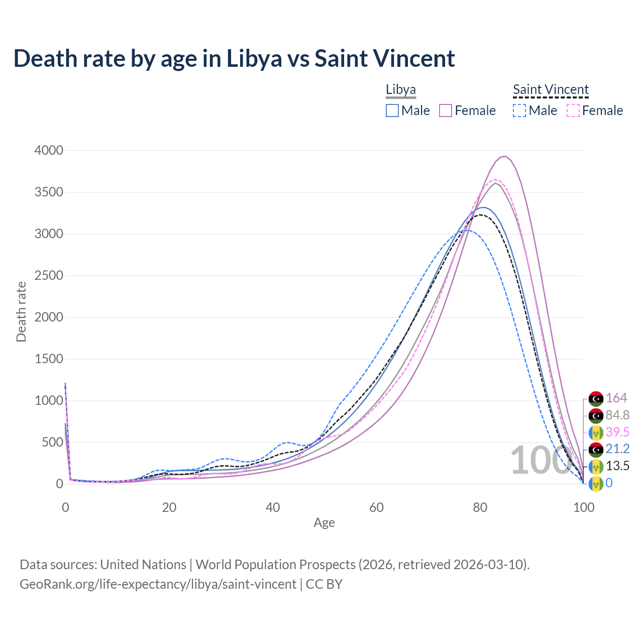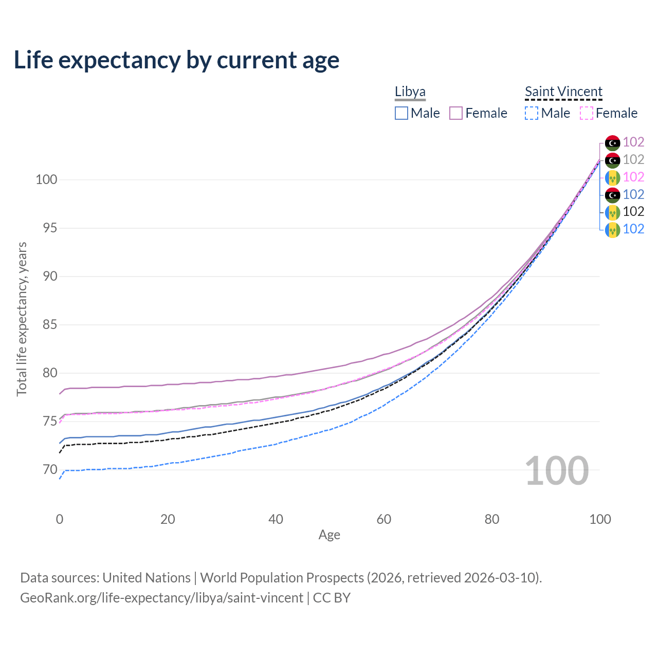 This life expectancy calculator shows the odds of living to 100, 95, 90, and below based on current age for both males and females in Libya and Saint Vincent, along with mean and median age of death. The calculations are based on the 2026 life tables (actuarial tables) from the UN World Population Prospects.