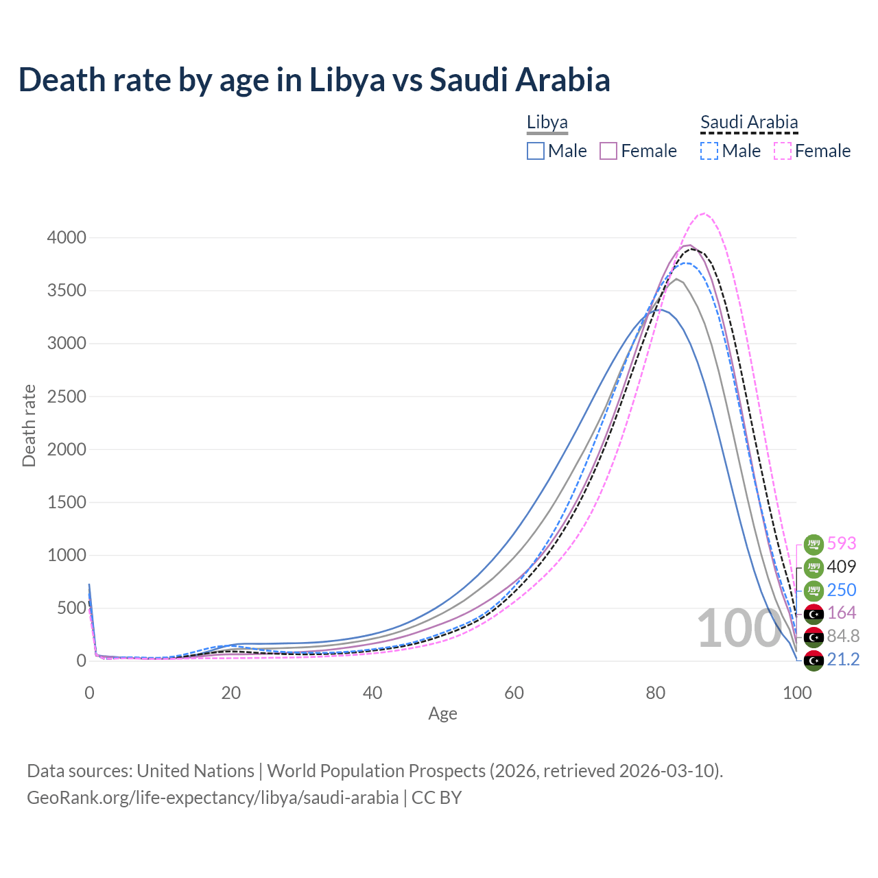 In Libya, the most common age of death is 83, compared to 85 in Saudi Arabia. The median age of death is 78.8 in Libya and 82.5 in Saudi Arabia, meaning only half of each cohort is expected to live past that age.