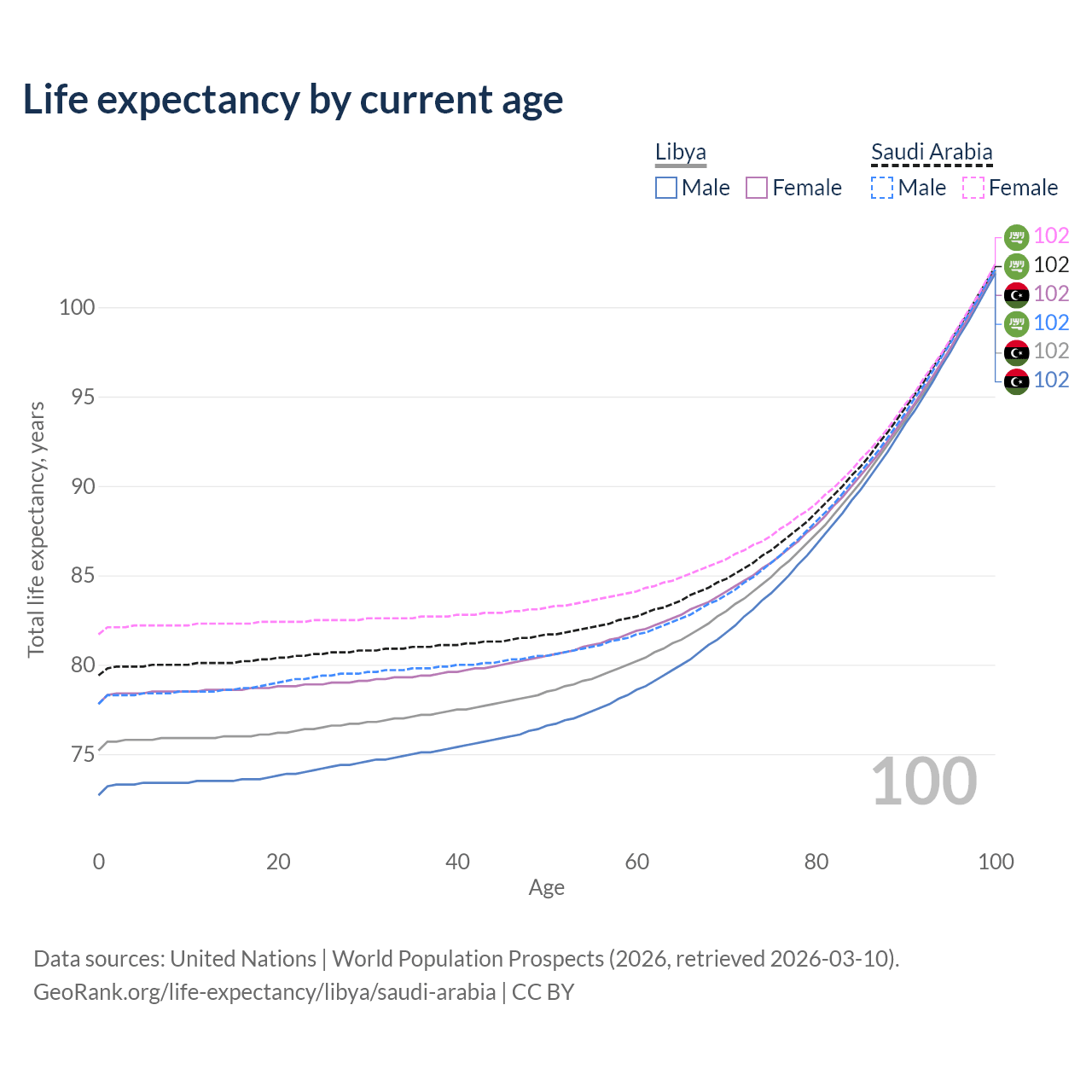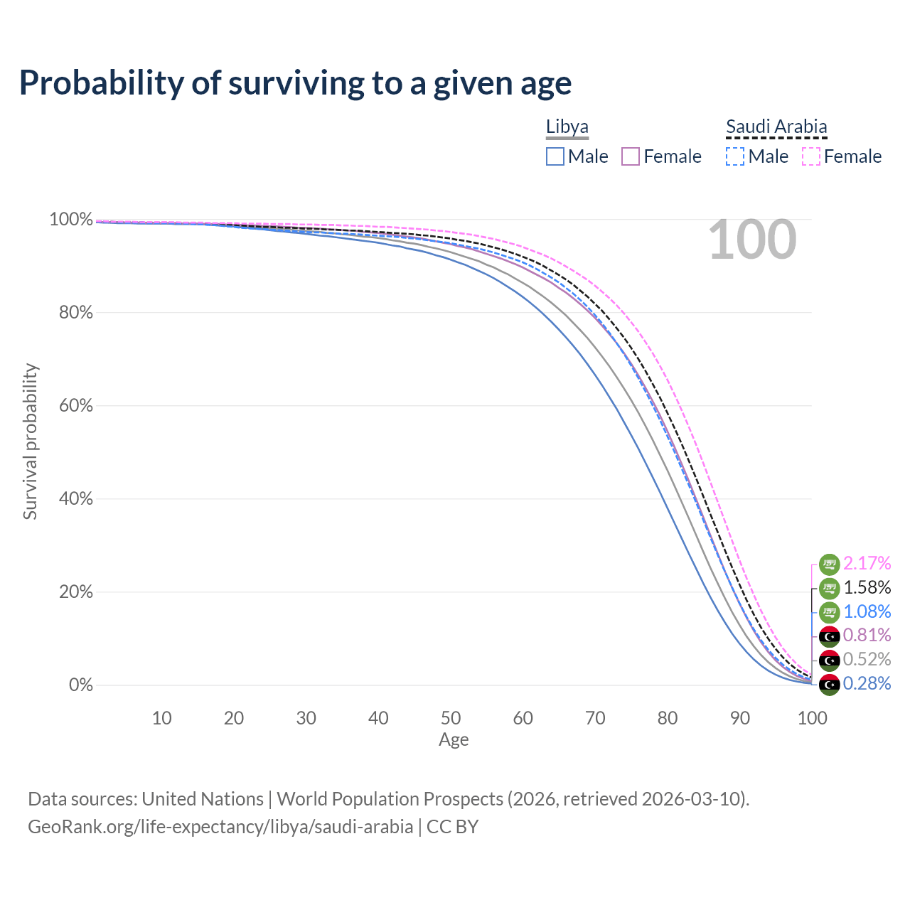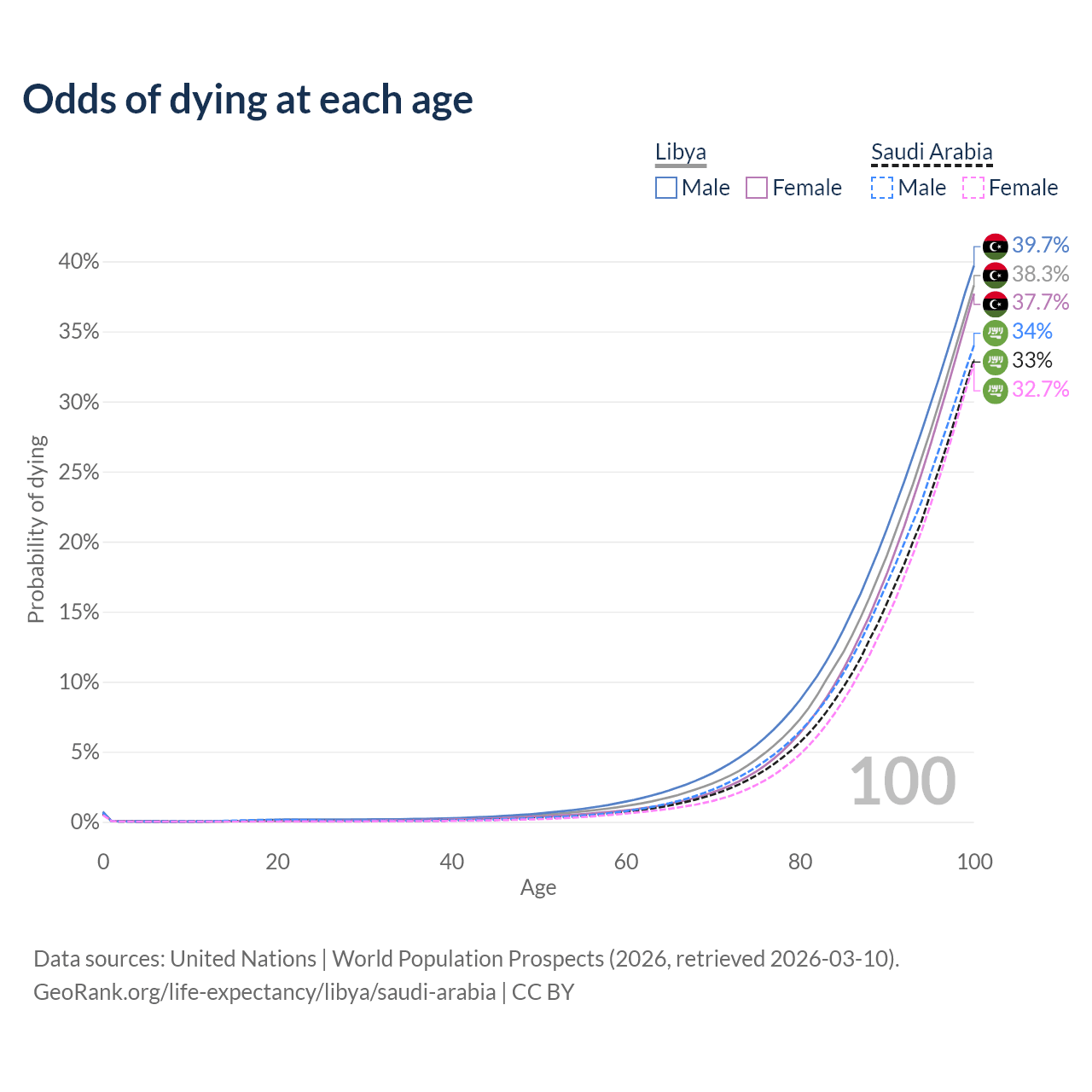This life expectancy calculator shows the odds of living to 100, 95, 90, and below based on current age for both males and females in Libya and Saudi Arabia, along with mean and median age of death. The calculations are based on the 2026 life tables (actuarial tables) from the UN World Population Prospects.