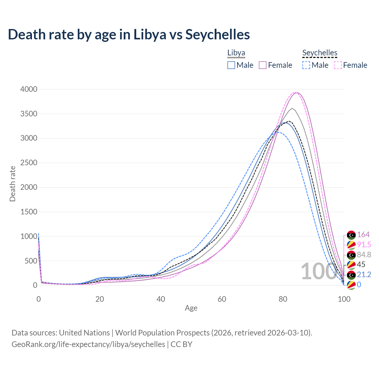 In Libya, the most common age of death is 83, compared to 82 in the Seychelles. The median age of death is 78.8 in Libya and 77 in the Seychelles, meaning only half of each cohort is expected to live past that age.