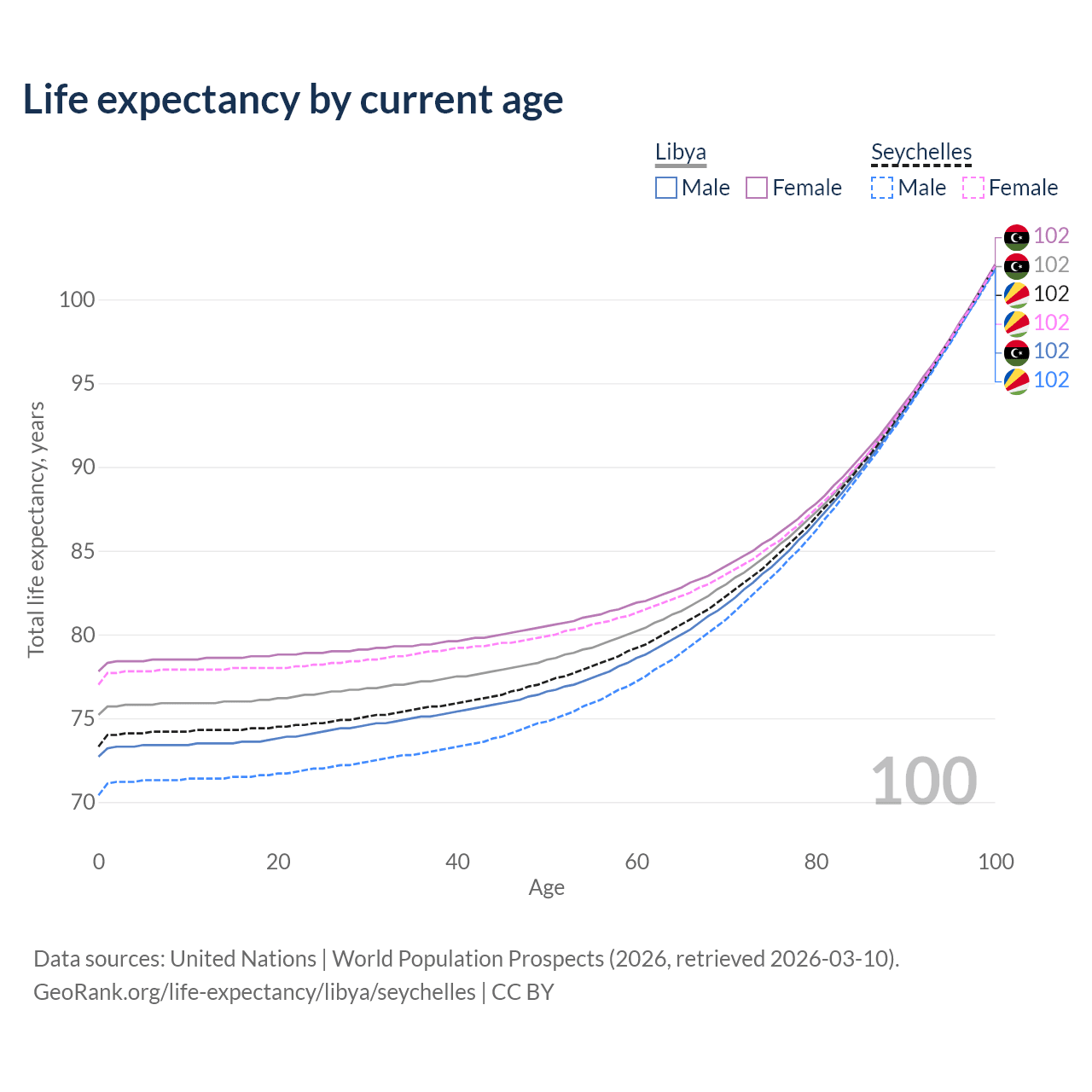 This life expectancy calculator shows the odds of living to 100, 95, 90, and below based on current age for both males and females in Libya and the Seychelles, along with mean and median age of death. The calculations are based on the 2026 life tables (actuarial tables) from the UN World Population Prospects.