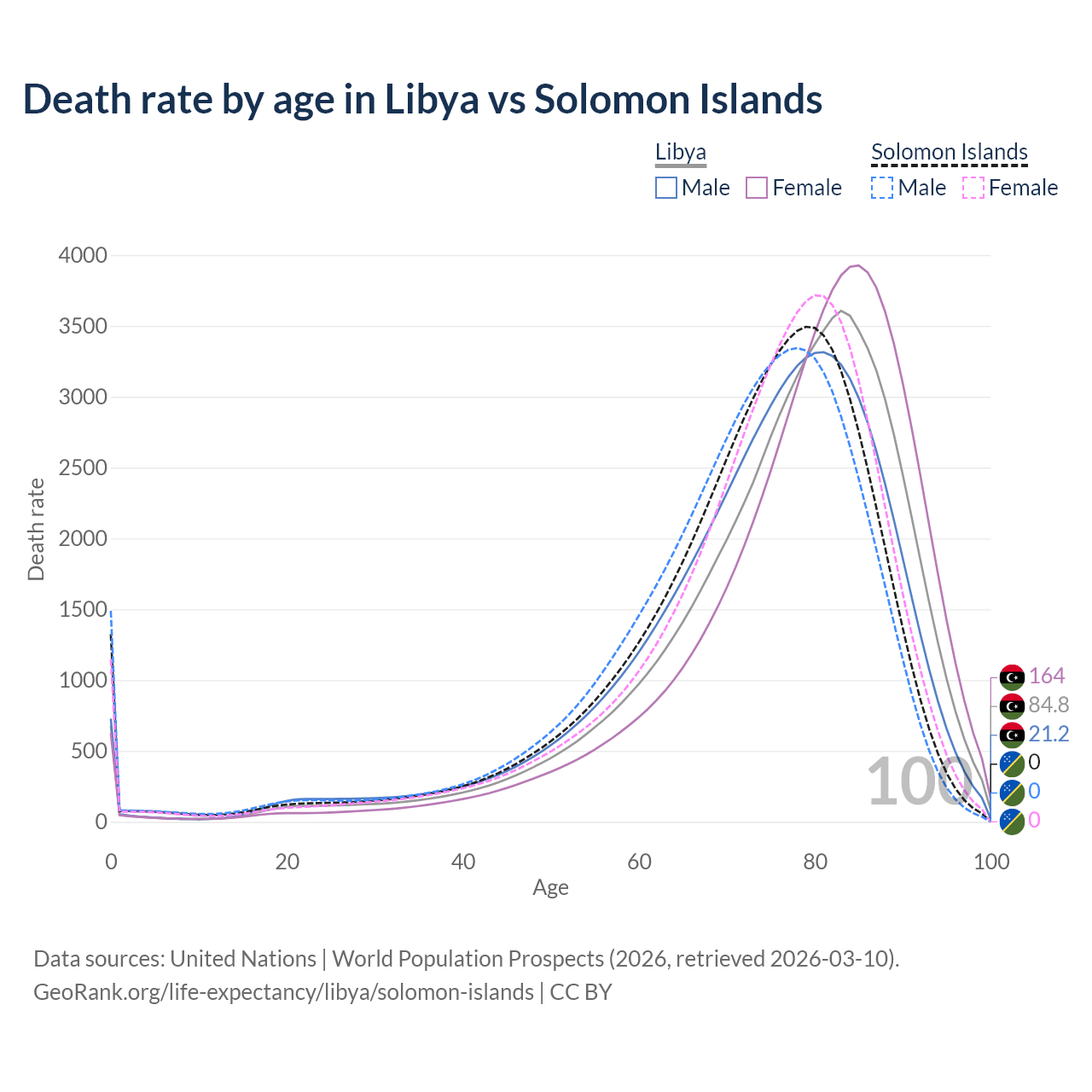 In Libya, the most common age of death is 83, compared to 79 in the Solomon Islands. The median age of death is 78.8 in Libya and 74.9 in the Solomon Islands, meaning only half of each cohort is expected to live past that age.