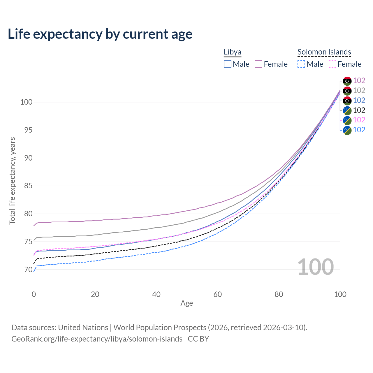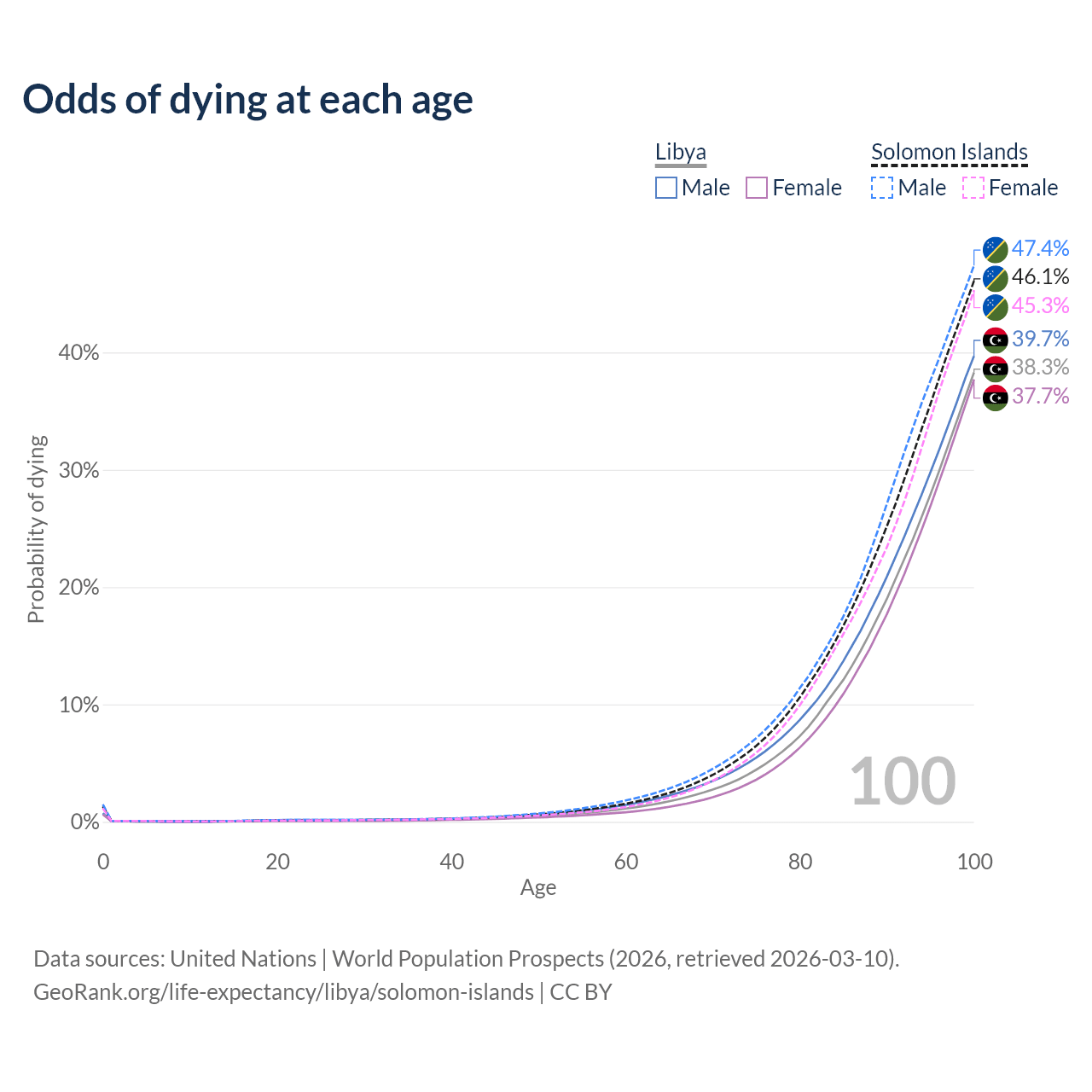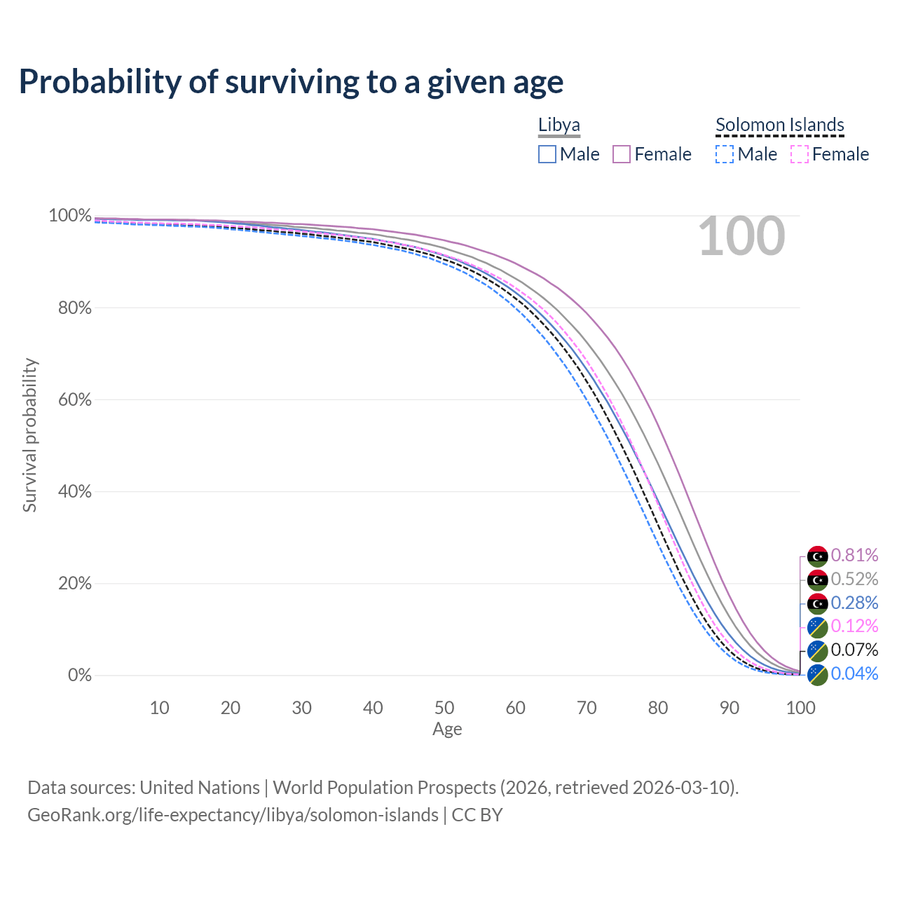 This life expectancy calculator shows the odds of living to 100, 95, 90, and below based on current age for both males and females in Libya and the Solomon Islands, along with mean and median age of death. The calculations are based on the 2026 life tables (actuarial tables) from the UN World Population Prospects.