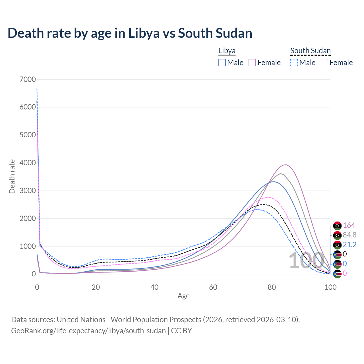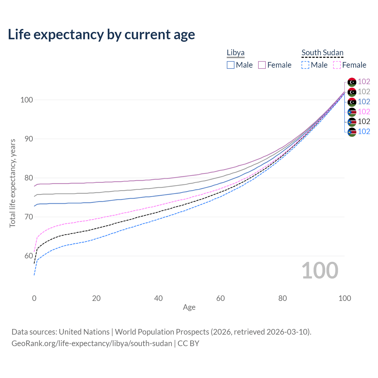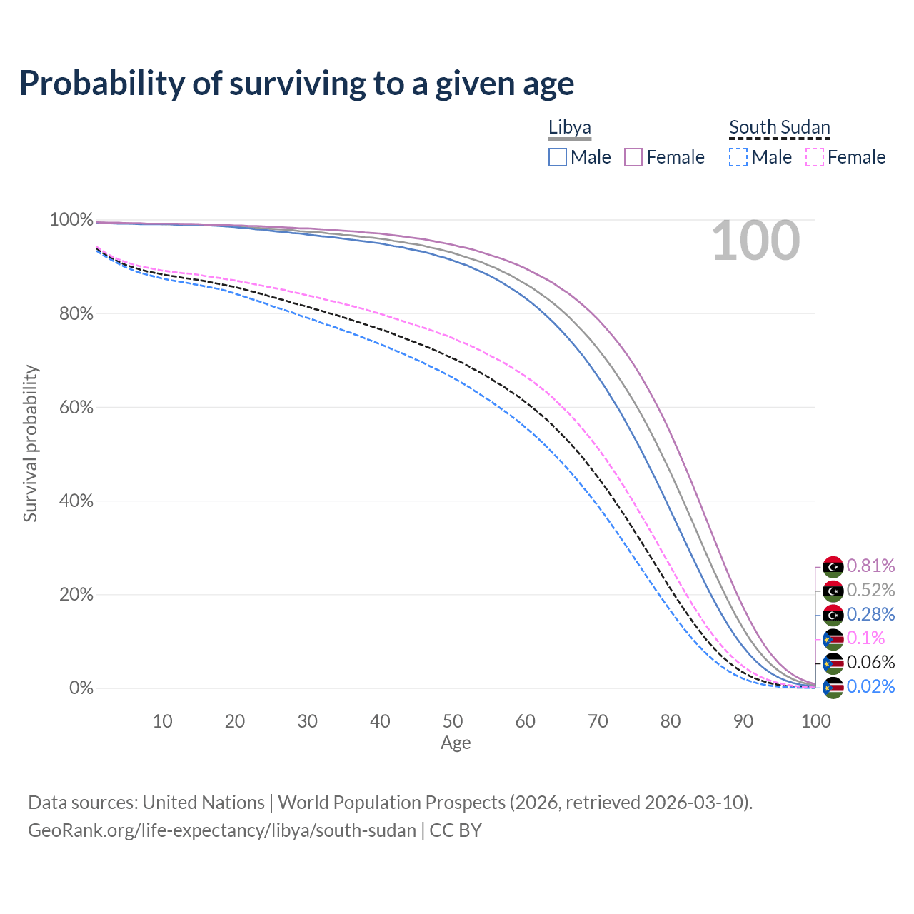 This life expectancy calculator shows the odds of living to 100, 95, 90, and below based on current age for both males and females in Libya and South Sudan, along with mean and median age of death. The calculations are based on the 2026 life tables (actuarial tables) from the UN World Population Prospects.
