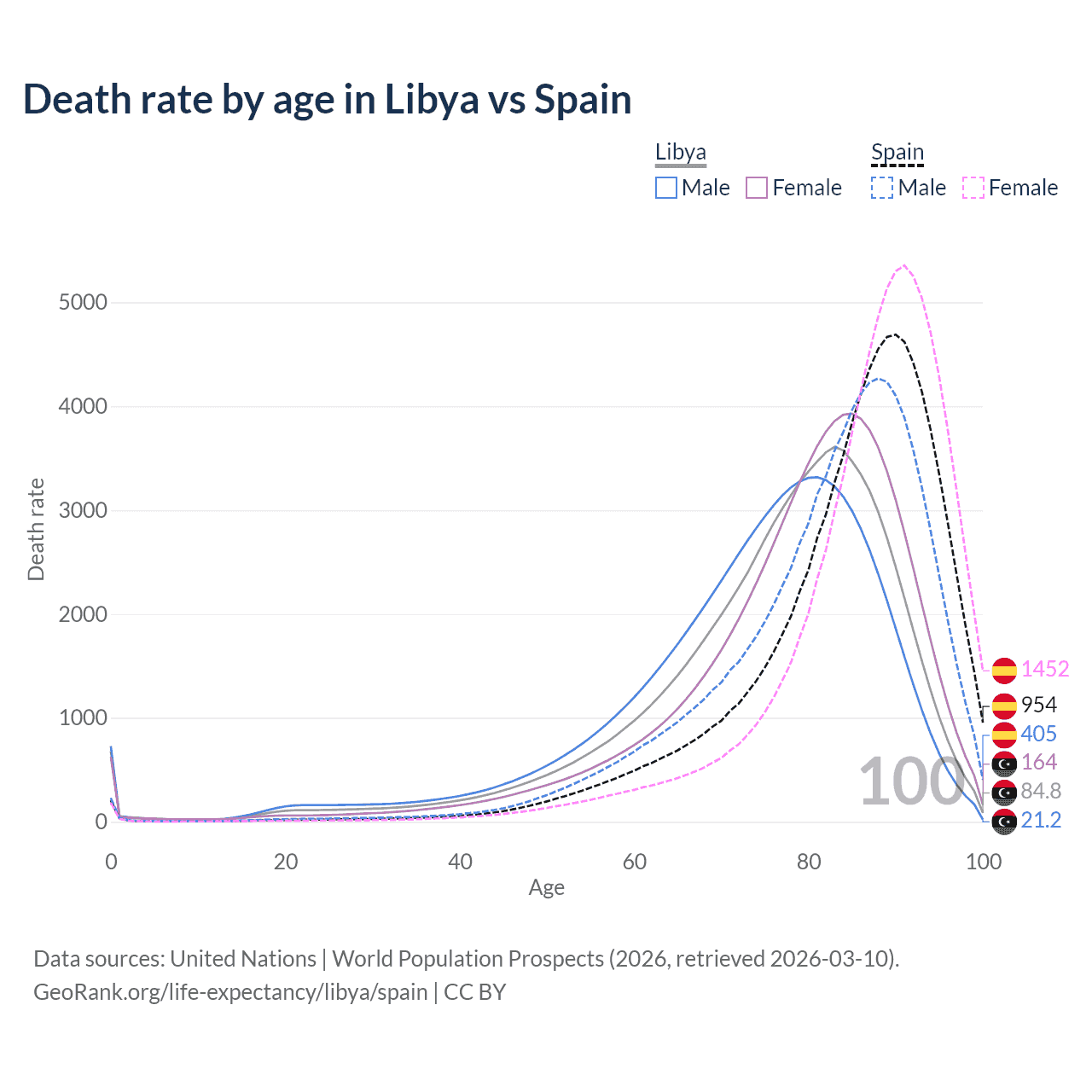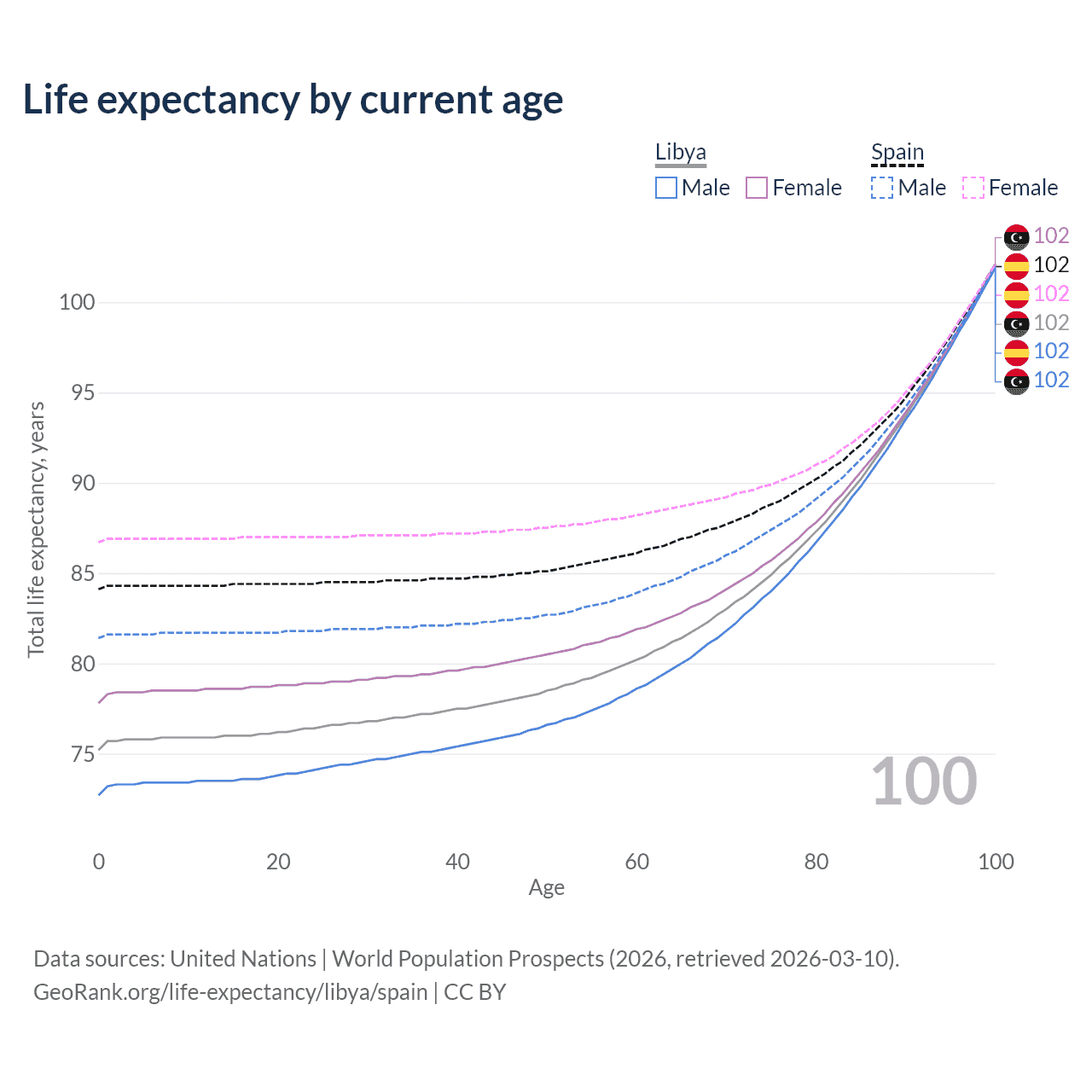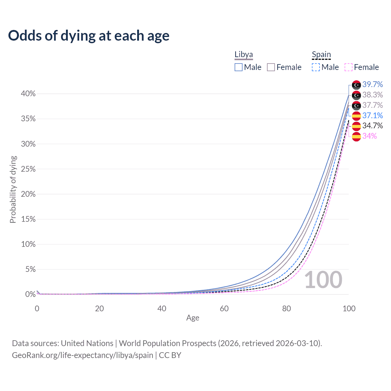 This life expectancy calculator shows the odds of living to 100, 95, 90, and below based on current age for both males and females in Libya and Spain, along with mean and median age of death. The calculations are based on the 2026 life tables (actuarial tables) from the UN World Population Prospects.