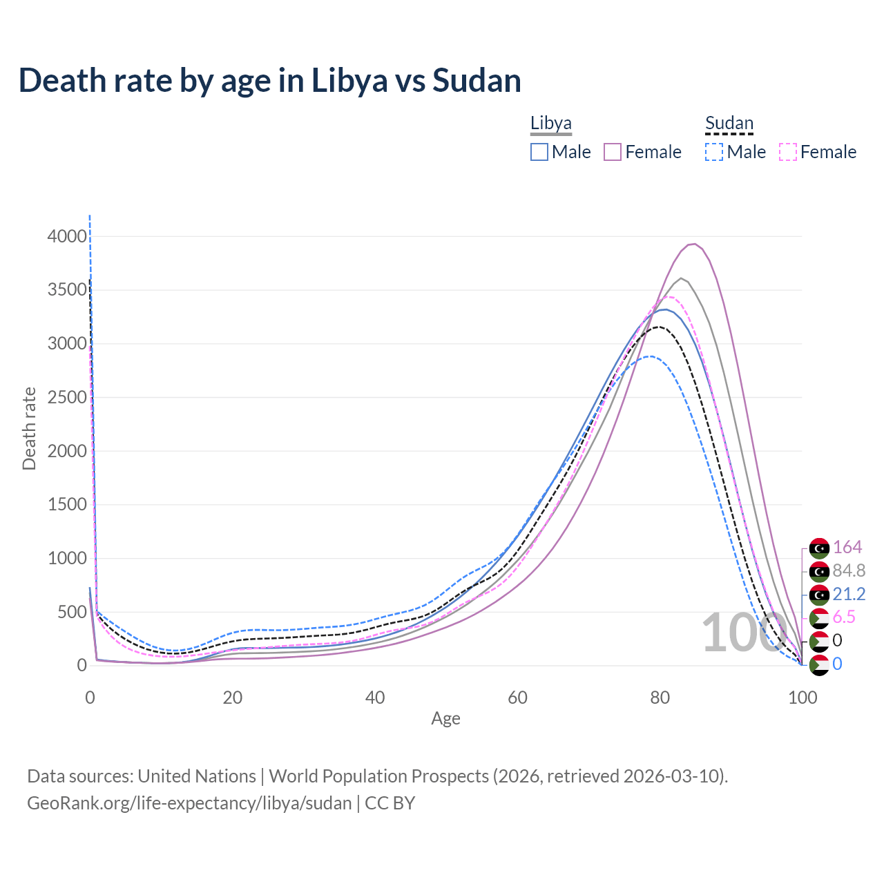 The average life expectancy at birth is 75.2 years in Libya vs 66.9 in Sudan. Libya is ranked 92/197 by life expectancy, and Sudan is 160/197. In Libya, the life expectancy is 72.7 years for males and 77.8 years for females. In Sudan, it's 63.8 years for males and 70.2 years for females.