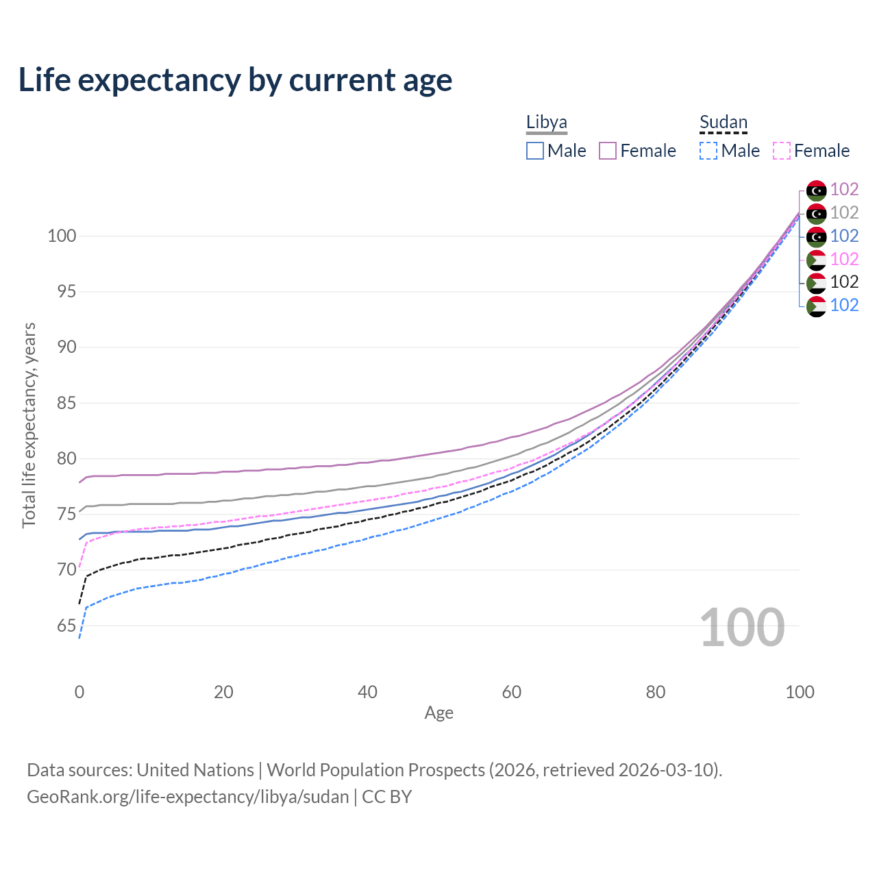 This life expectancy calculator shows the odds of living to 100, 95, 90, and below based on current age for both males and females in Libya and Sudan, along with mean and median age of death. The calculations are based on the 2026 life tables (actuarial tables) from the UN World Population Prospects.
