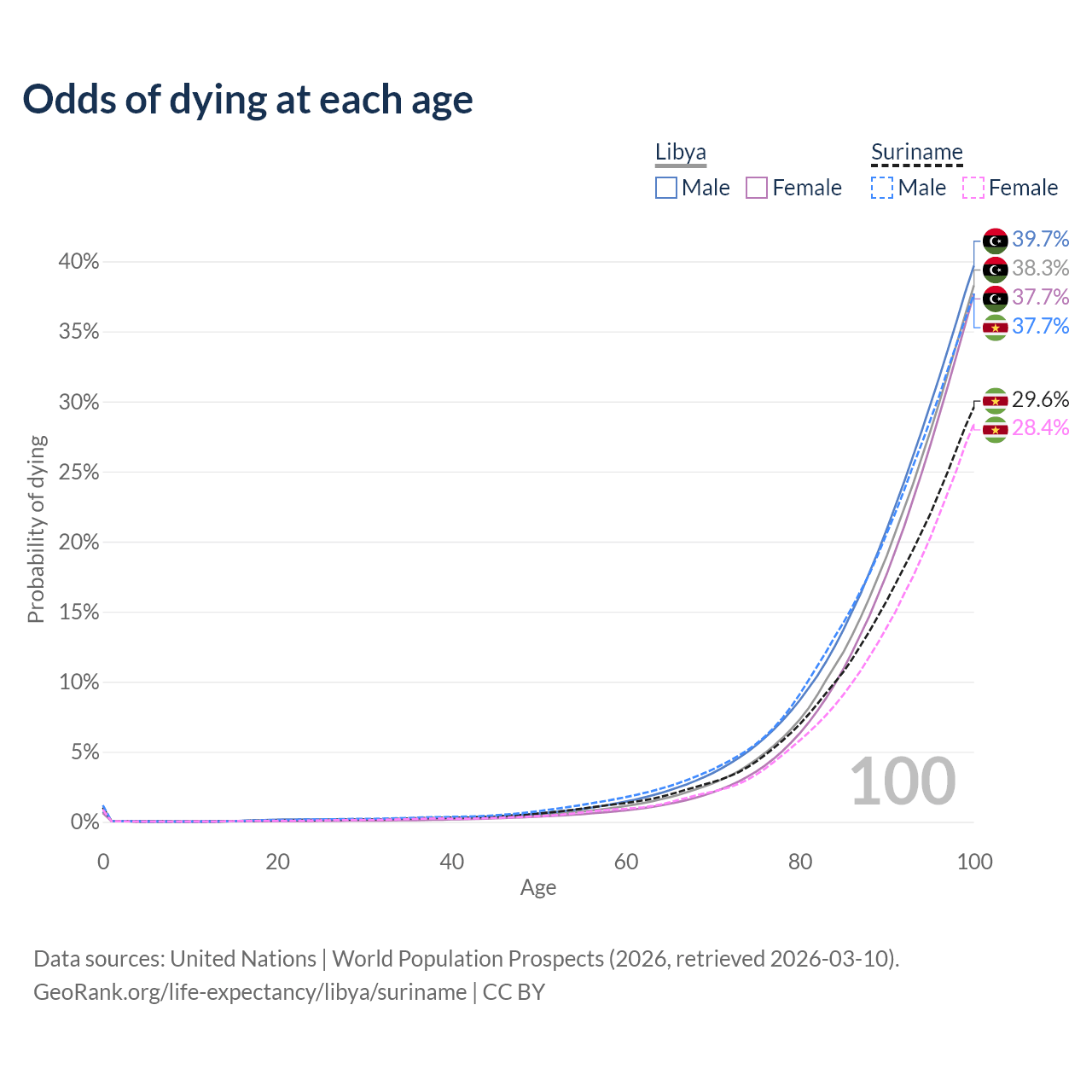 This life expectancy calculator shows the odds of living to 100, 95, 90, and below based on current age for both males and females in Libya and Suriname, along with mean and median age of death. The calculations are based on the 2026 life tables (actuarial tables) from the UN World Population Prospects.