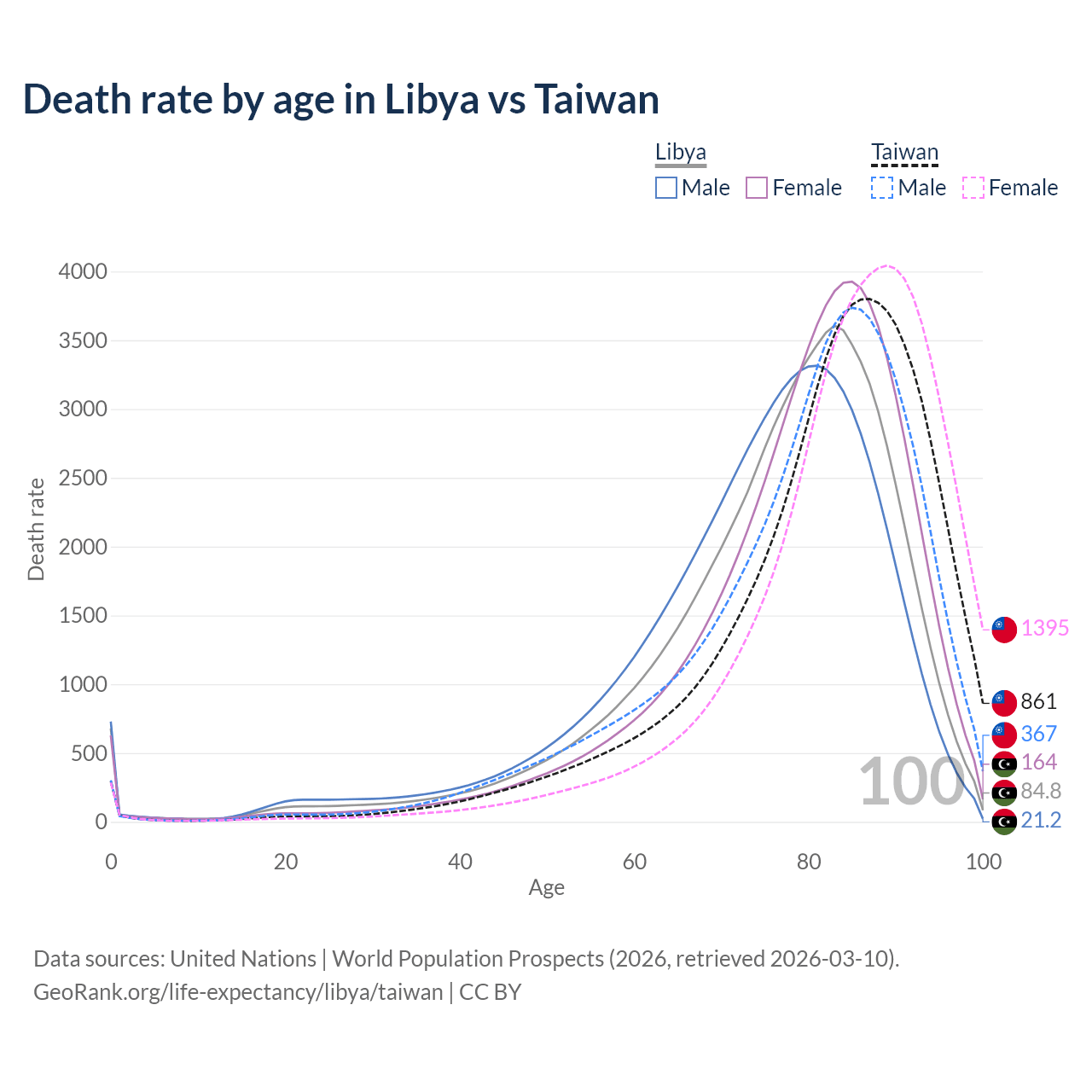 The average life expectancy at birth is 75.2 years in Libya vs 81.1 in Taiwan. Libya is ranked 92/197 by life expectancy, and Taiwan is 40/197. In Libya, the life expectancy is 72.7 years for males and 77.8 years for females. In Taiwan, it's 78.3 years for males and 84 years for females.