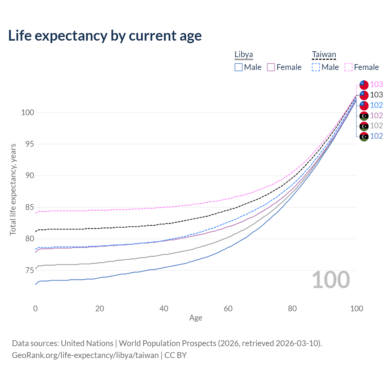 This life expectancy calculator shows the odds of living to 100, 95, 90, and below based on current age for both males and females in Libya and Taiwan, along with mean and median age of death. The calculations are based on the 2026 life tables (actuarial tables) from the UN World Population Prospects.