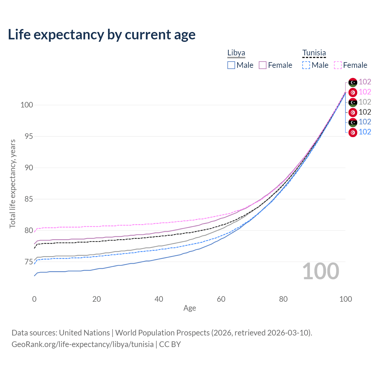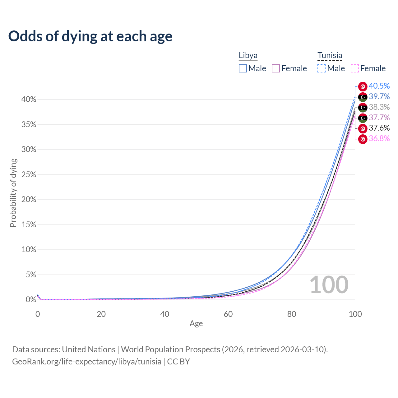 This life expectancy calculator shows the odds of living to 100, 95, 90, and below based on current age for both males and females in Libya and Tunisia, along with mean and median age of death. The calculations are based on the 2026 life tables (actuarial tables) from the UN World Population Prospects.