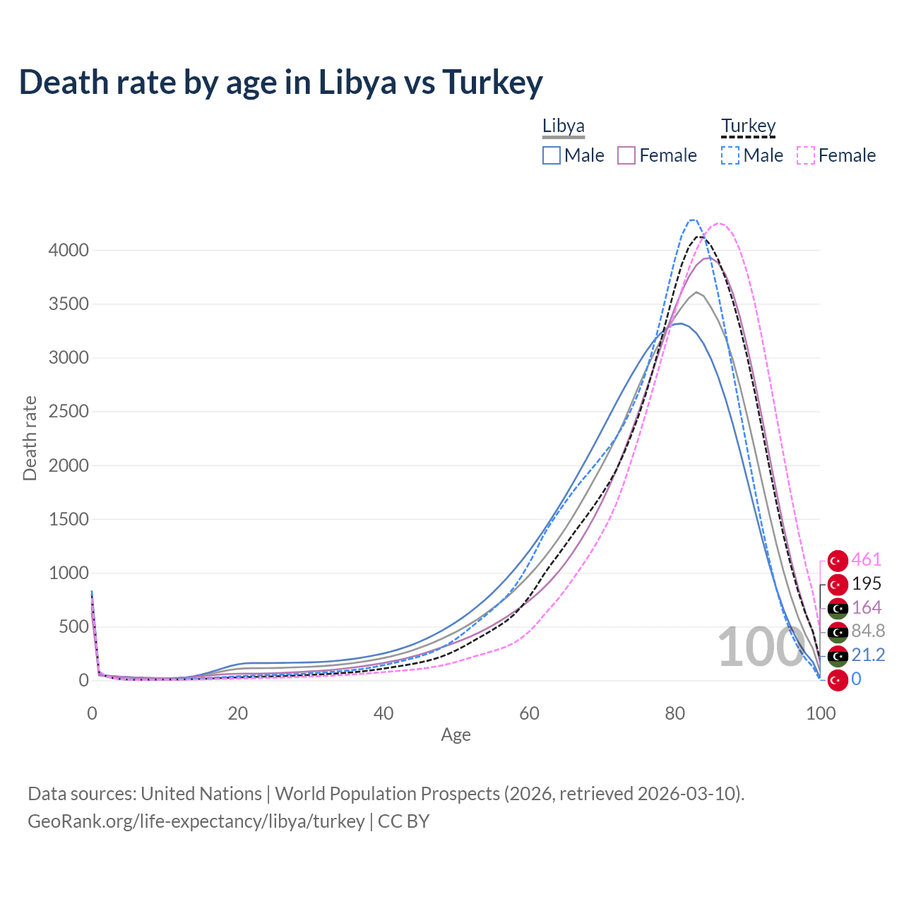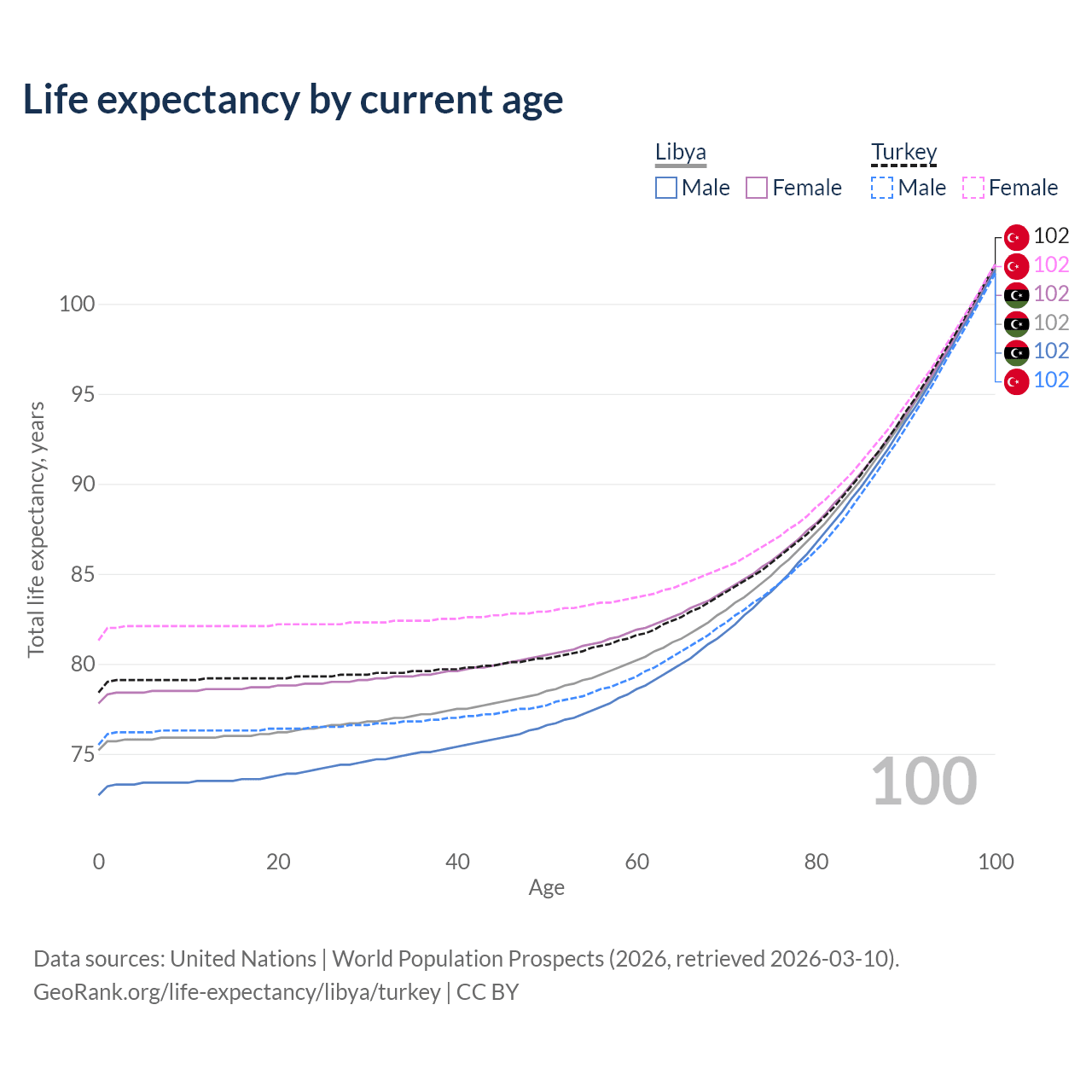 This life expectancy calculator shows the odds of living to 100, 95, 90, and below based on current age for both males and females in Libya and Turkey, along with mean and median age of death. The calculations are based on the 2026 life tables (actuarial tables) from the UN World Population Prospects.
