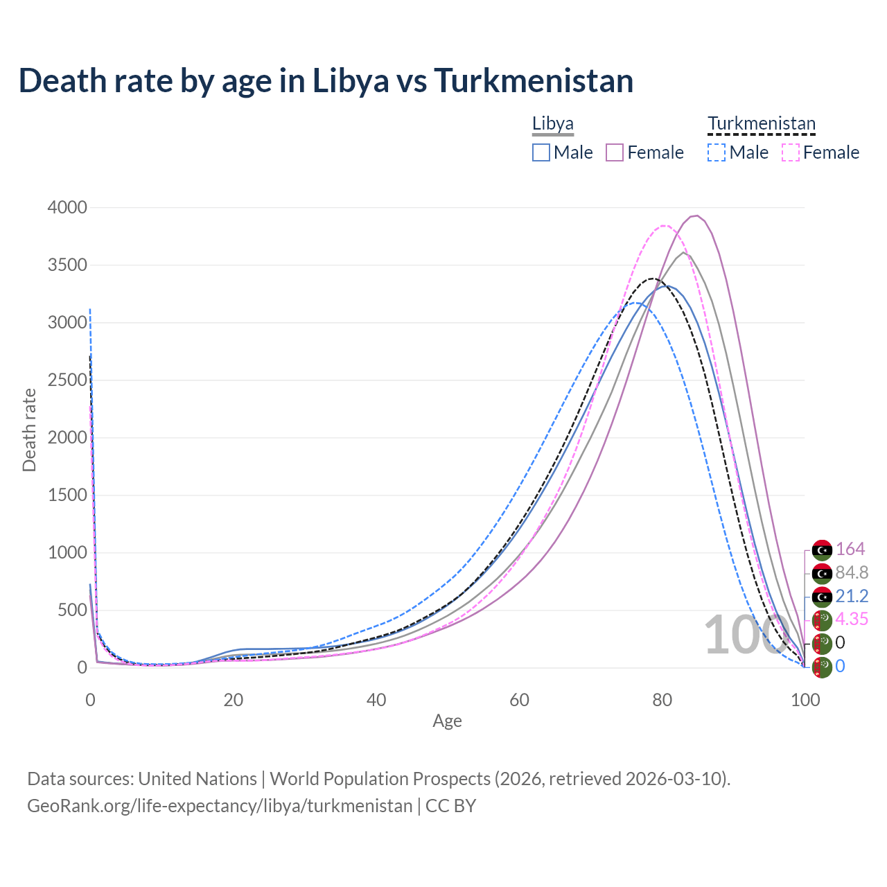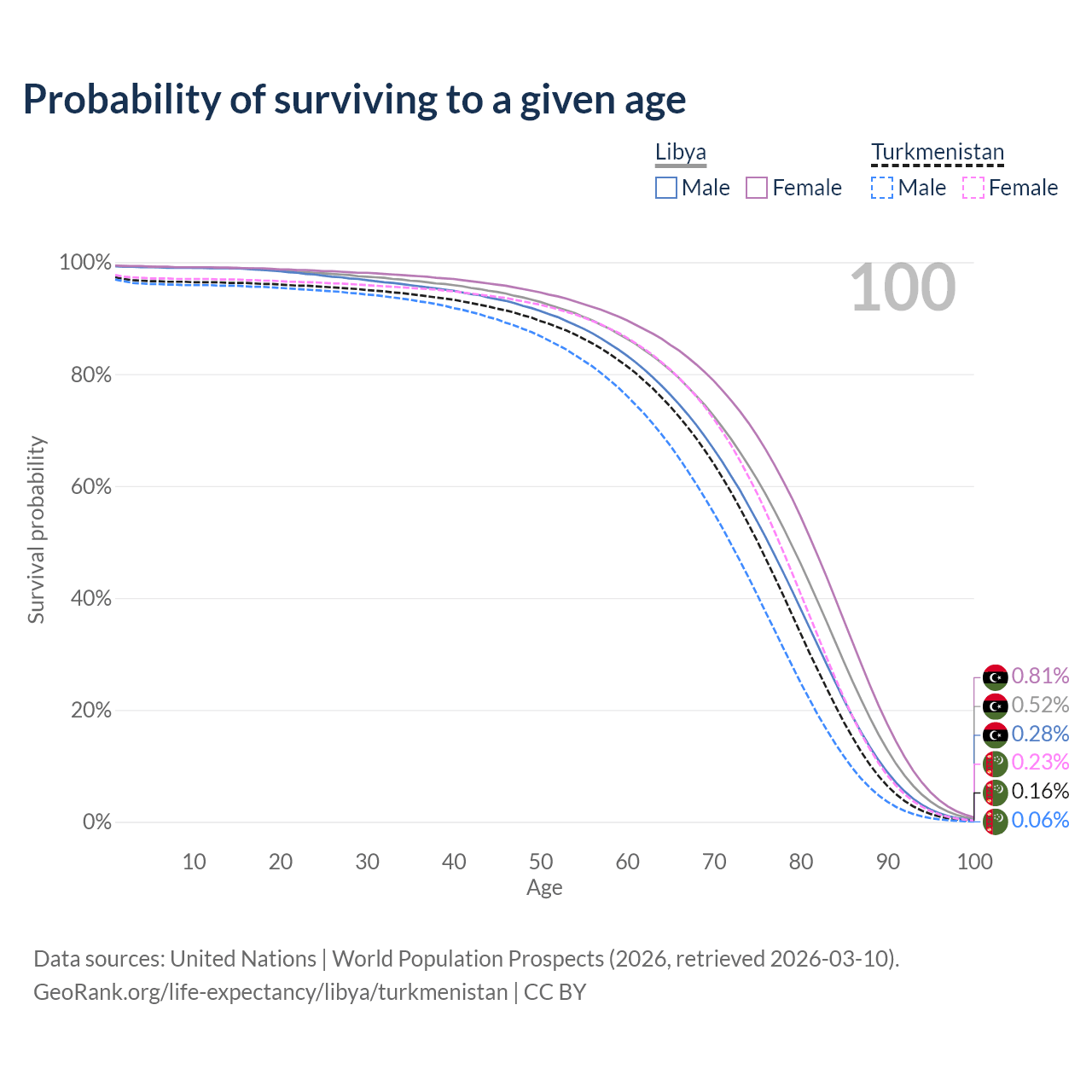 This life expectancy calculator shows the odds of living to 100, 95, 90, and below based on current age for both males and females in Libya and Turkmenistan, along with mean and median age of death. The calculations are based on the 2026 life tables (actuarial tables) from the UN World Population Prospects.