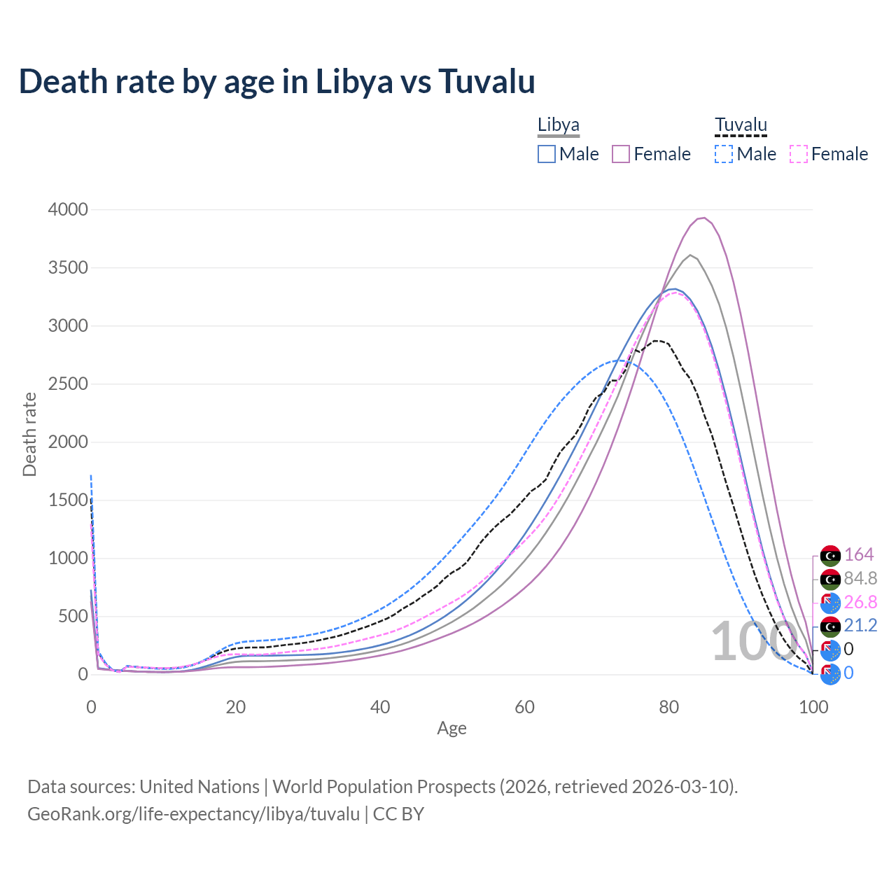 In Libya, the most common age of death is 83, compared to 78 in Tuvalu. The median age of death is 78.8 in Libya and 71.9 in Tuvalu, meaning only half of each cohort is expected to live past that age.