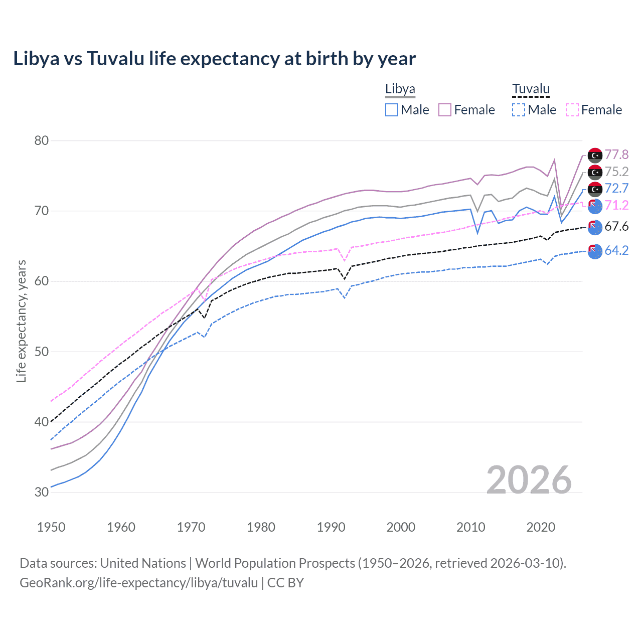 The average life expectancy at birth is 75.2 years in Libya vs 67.6 in Tuvalu. Libya is ranked 92/197 by life expectancy, and Tuvalu is 156/197. In Libya, the life expectancy is 72.7 years for males and 77.8 years for females. In Tuvalu, it's 64.2 years for males and 71.2 years for females.