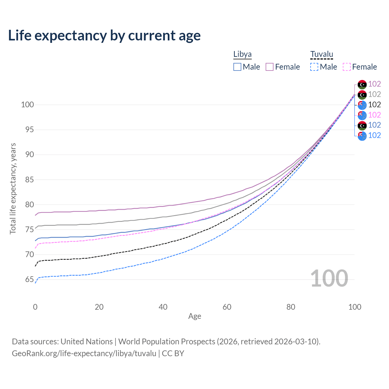 This life expectancy calculator shows the odds of living to 100, 95, 90, and below based on current age for both males and females in Libya and Tuvalu, along with mean and median age of death. The calculations are based on the 2026 life tables (actuarial tables) from the UN World Population Prospects.