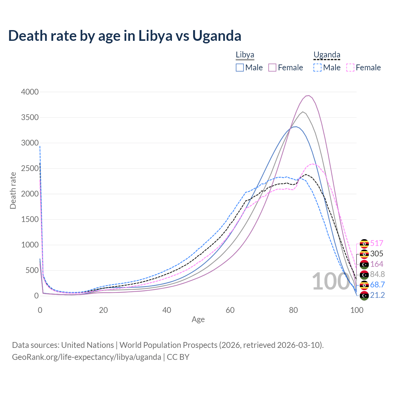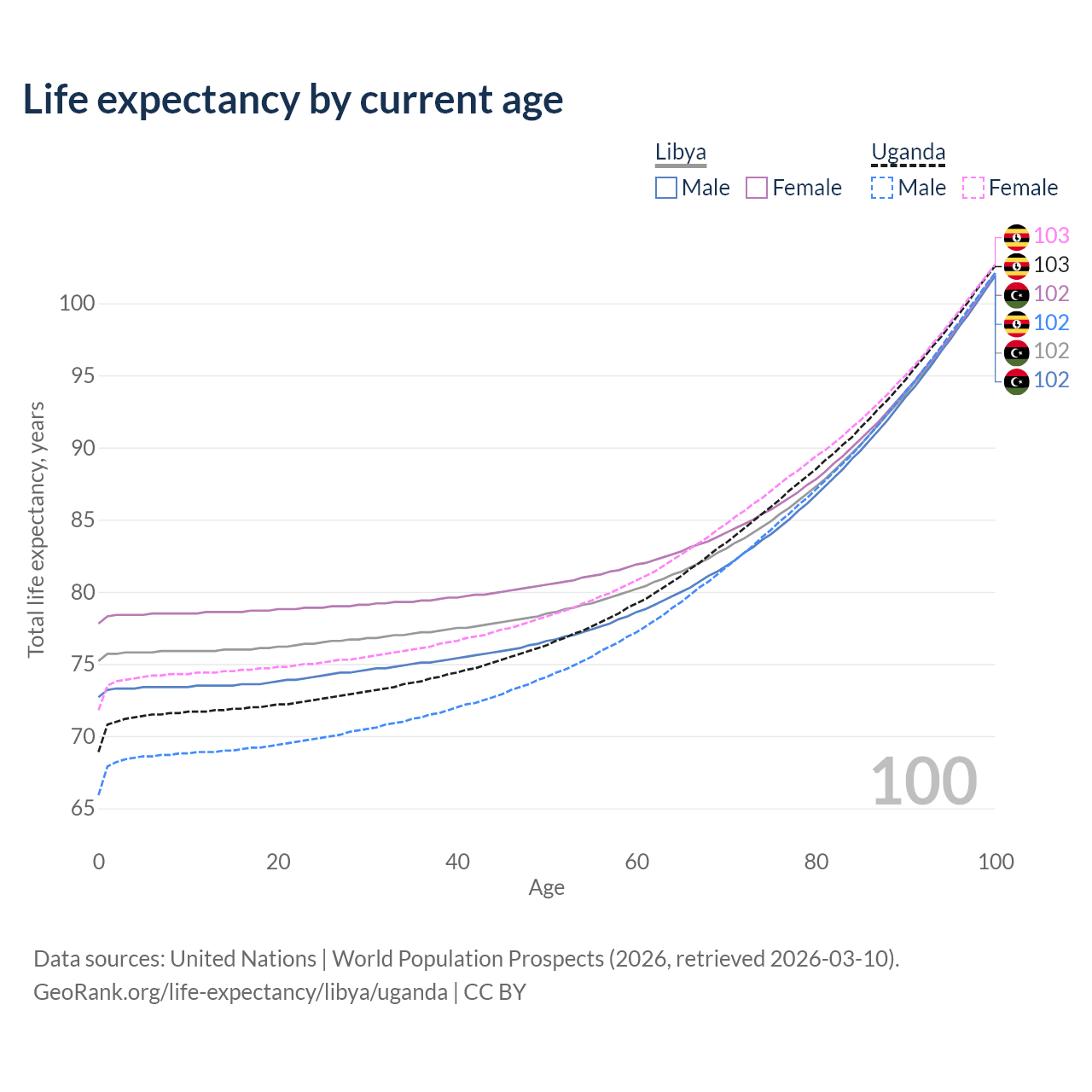 The average life expectancy at birth is 75.2 years in Libya vs 68.9 in Uganda. Libya is ranked 92/197 by life expectancy, and Uganda is 146/197. In Libya, the life expectancy is 72.7 years for males and 77.8 years for females. In Uganda, it's 65.9 years for males and 71.8 years for females.