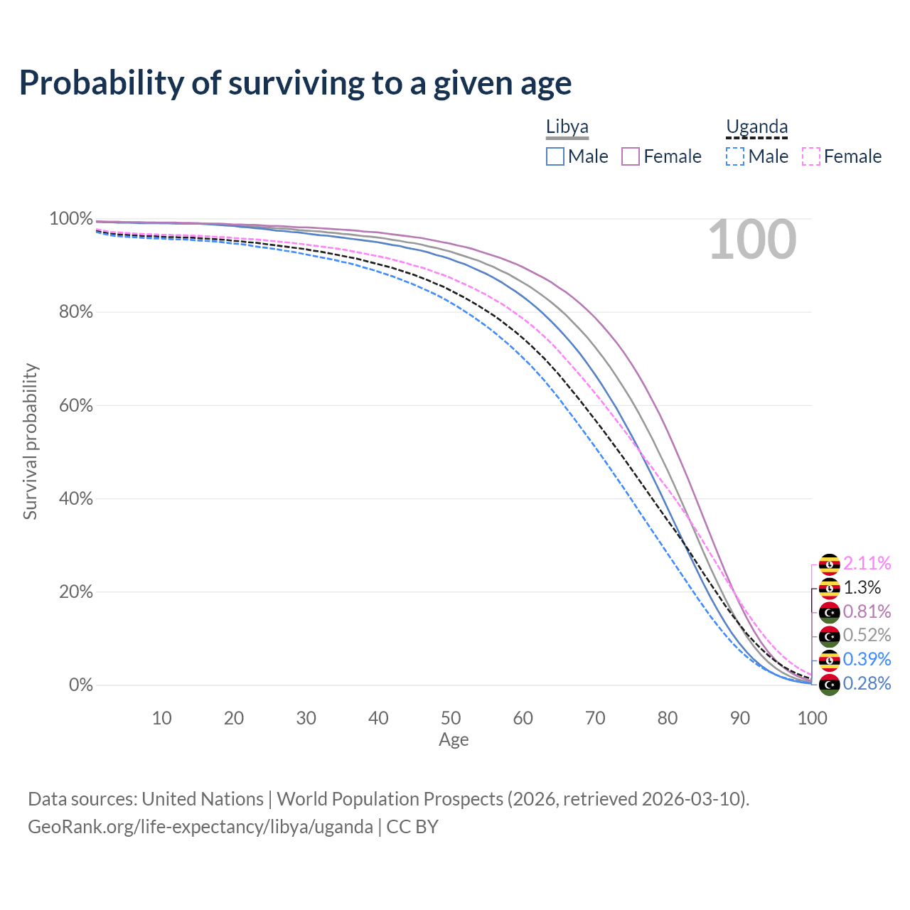 This life expectancy calculator shows the odds of living to 100, 95, 90, and below based on current age for both males and females in Libya and Uganda, along with mean and median age of death. The calculations are based on the 2026 life tables (actuarial tables) from the UN World Population Prospects.