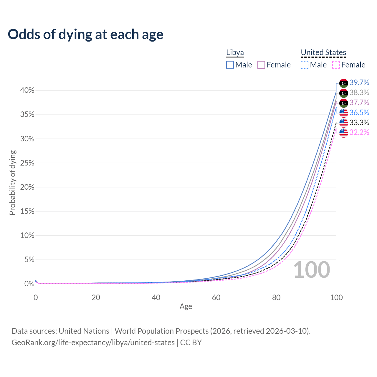 This life expectancy calculator shows the odds of living to 100, 95, 90, and below based on current age for both males and females in Libya and the United States, along with mean and median age of death. The calculations are based on the 2026 life tables (actuarial tables) from the UN World Population Prospects.