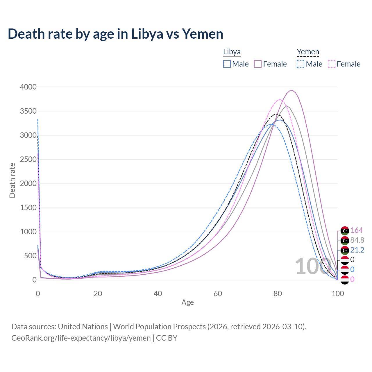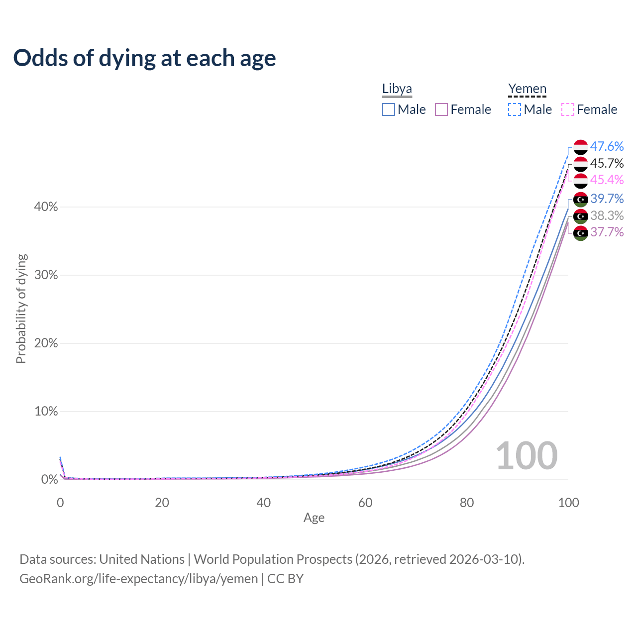 This life expectancy calculator shows the odds of living to 100, 95, 90, and below based on current age for both males and females in Libya and Yemen, along with mean and median age of death. The calculations are based on the 2026 life tables (actuarial tables) from the UN World Population Prospects.