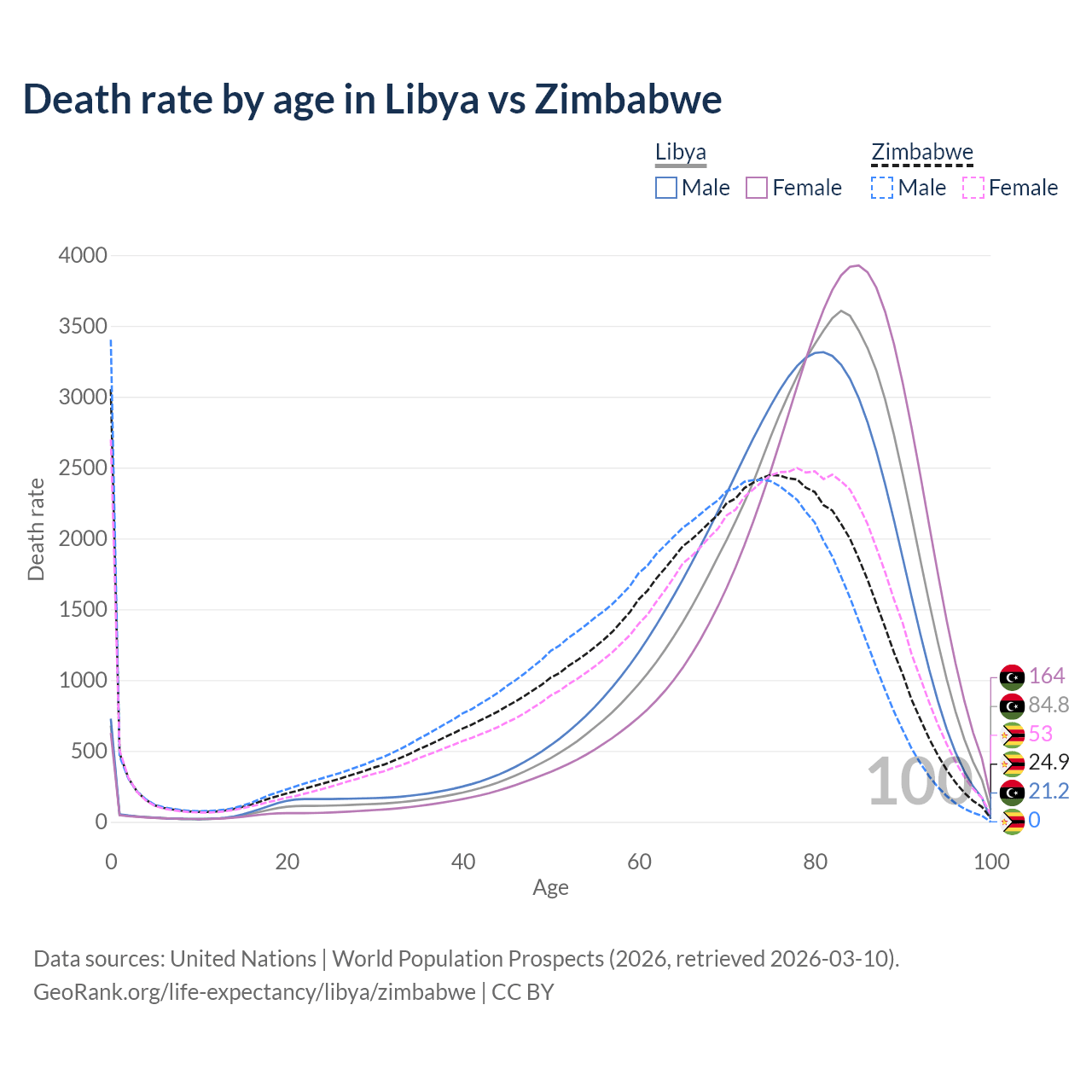 The average life expectancy at birth is 75.2 years in Libya vs 63.6 in Zimbabwe. Libya is ranked 92/197 by life expectancy, and Zimbabwe is 180/197. In Libya, the life expectancy is 72.7 years for males and 77.8 years for females. In Zimbabwe, it's 61 years for males and 65.9 years for females.